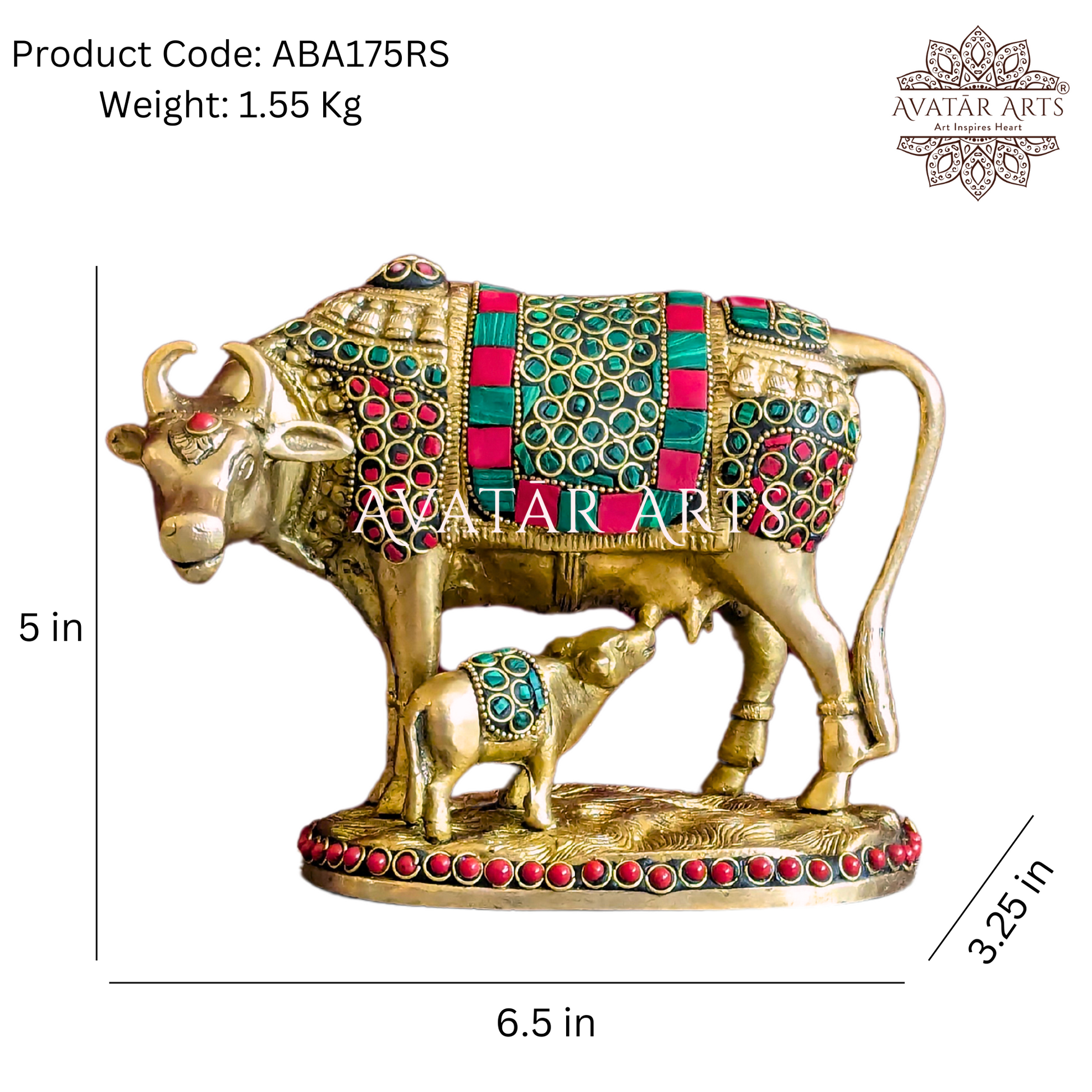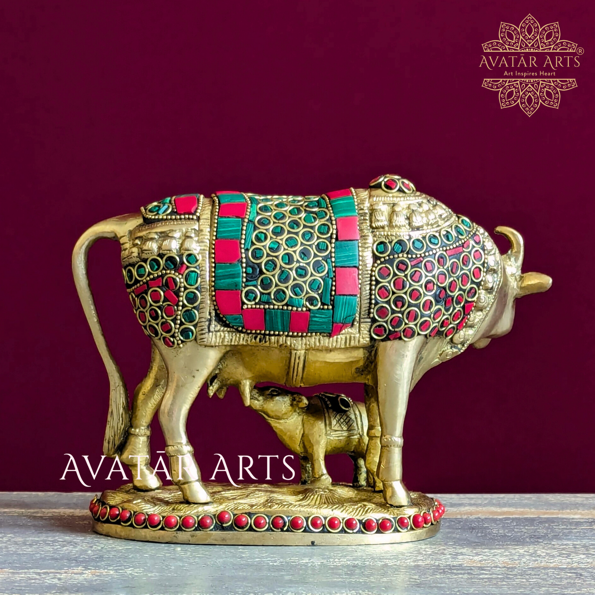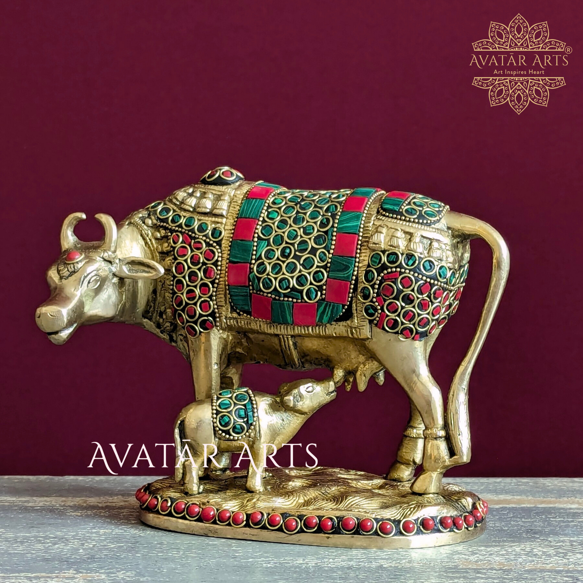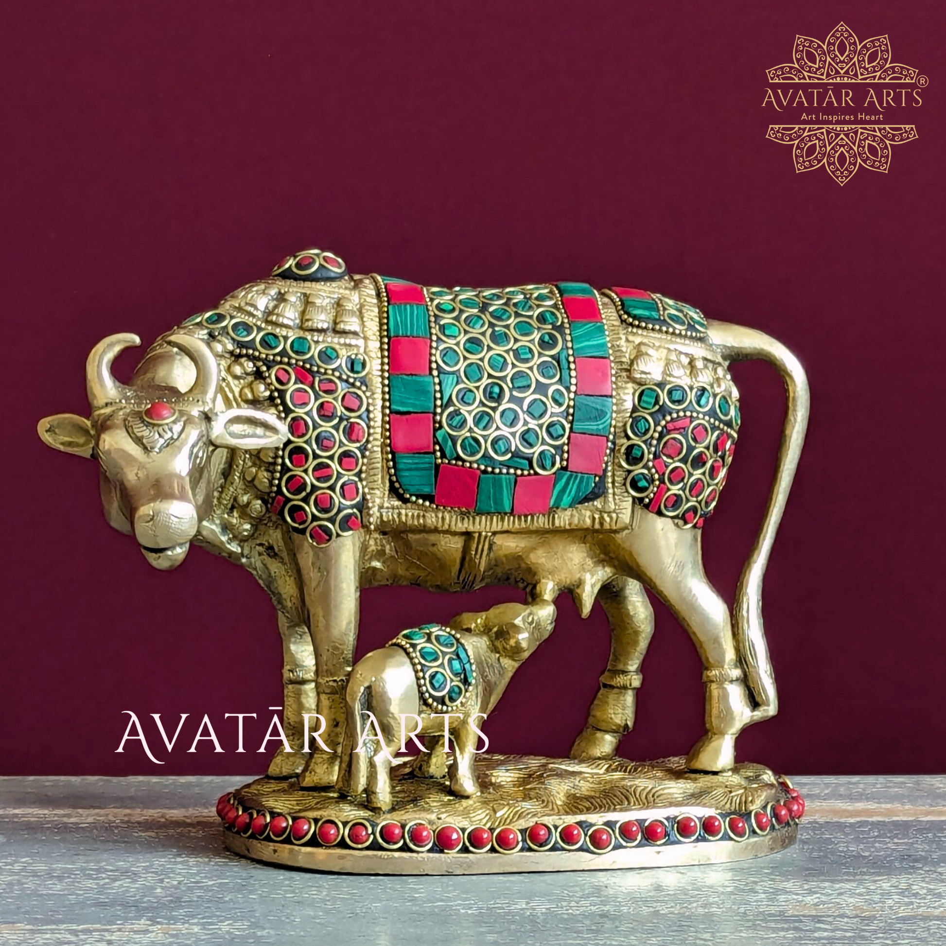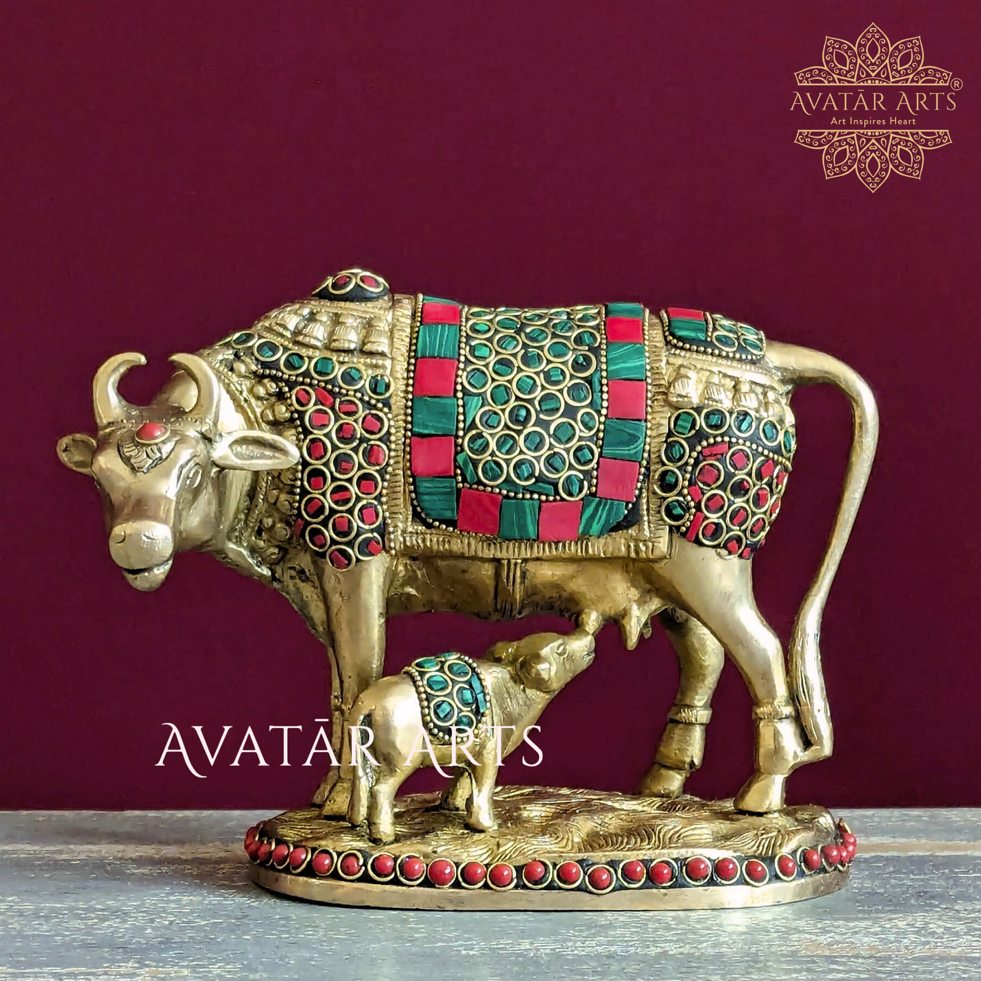 Welcome our stunning brass idol of a cow and her calf, intricately adorned with exquisite stone and ring work. Crafted with unparalleled quality, precision workmanship, and a flawless finish, this piece exudes timeless elegance.