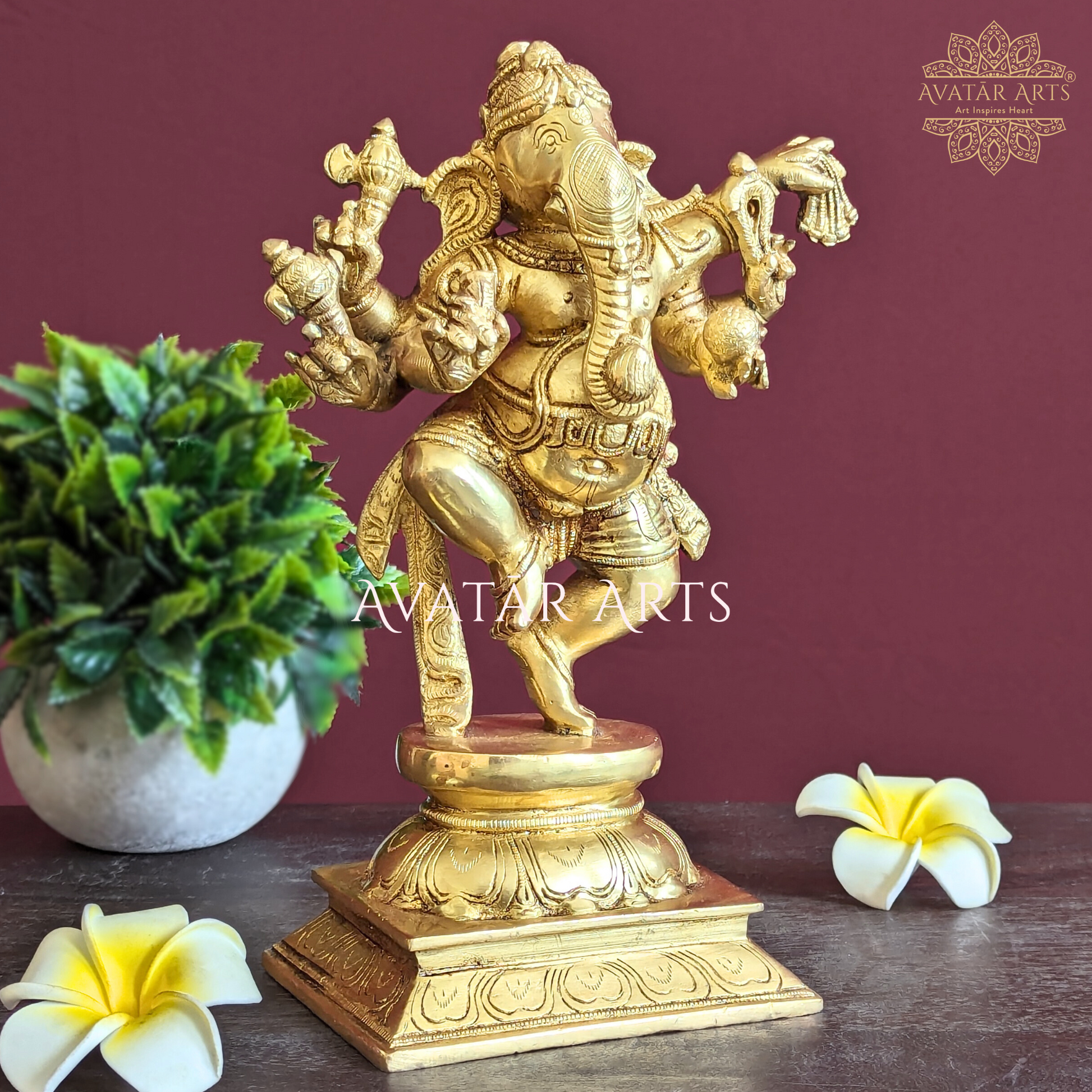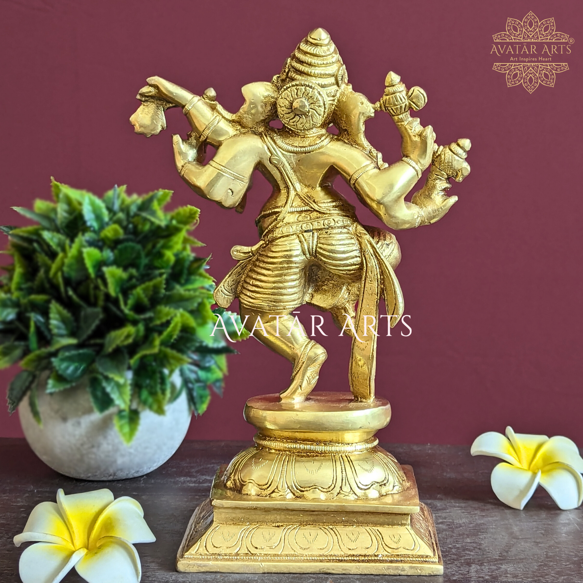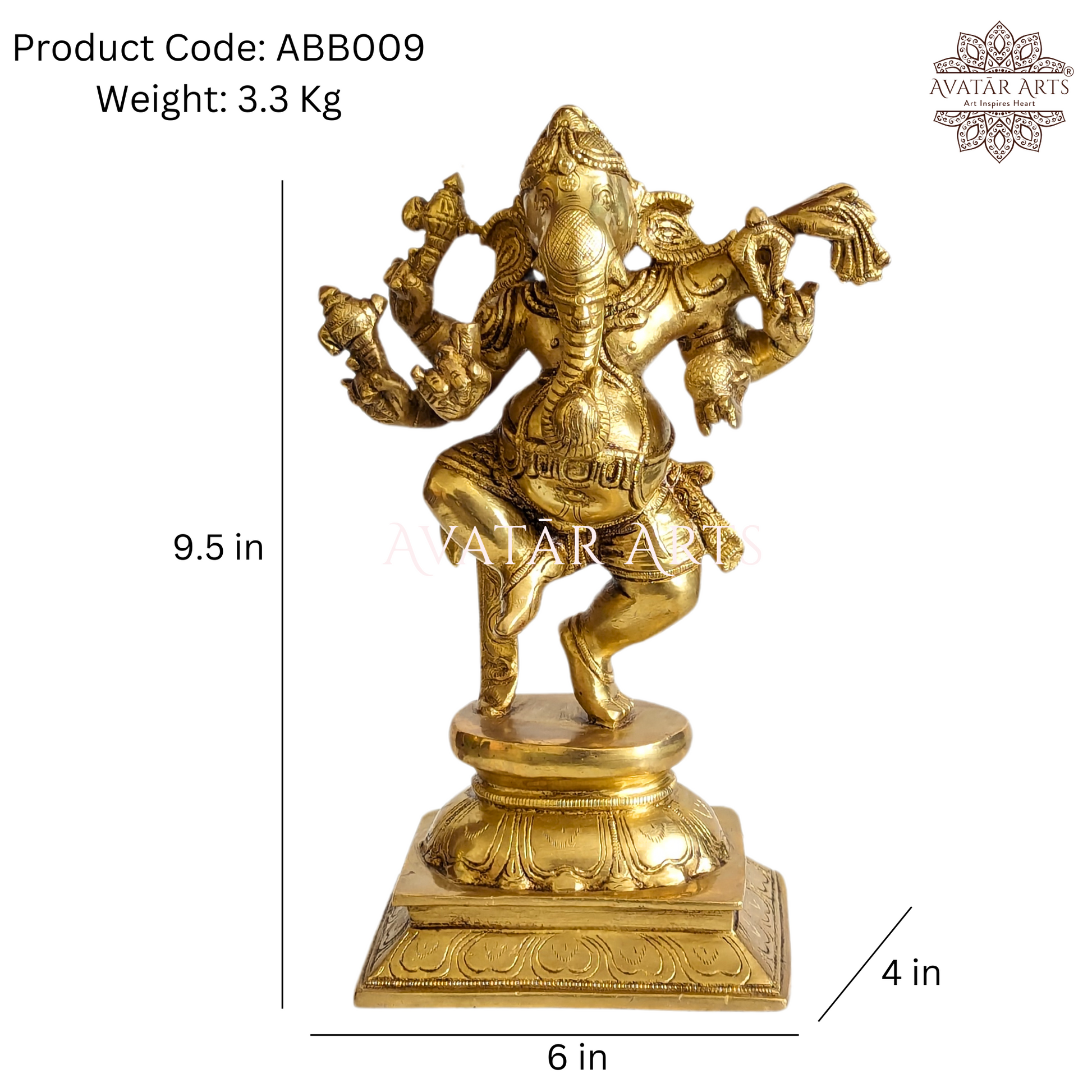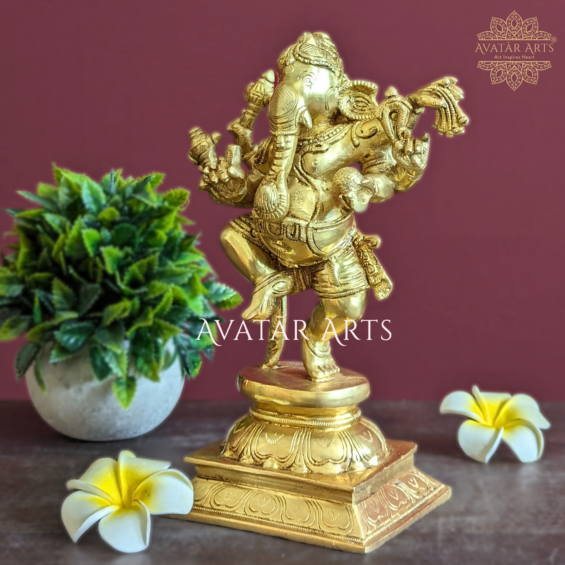 Immerse your space in divine energy with the exquisite brass statue of dancing Lord Ganesha. This intricate portrayal captures the essence of joy and celebration, symbolising the divine dance of creation and the triumph over obstacles.