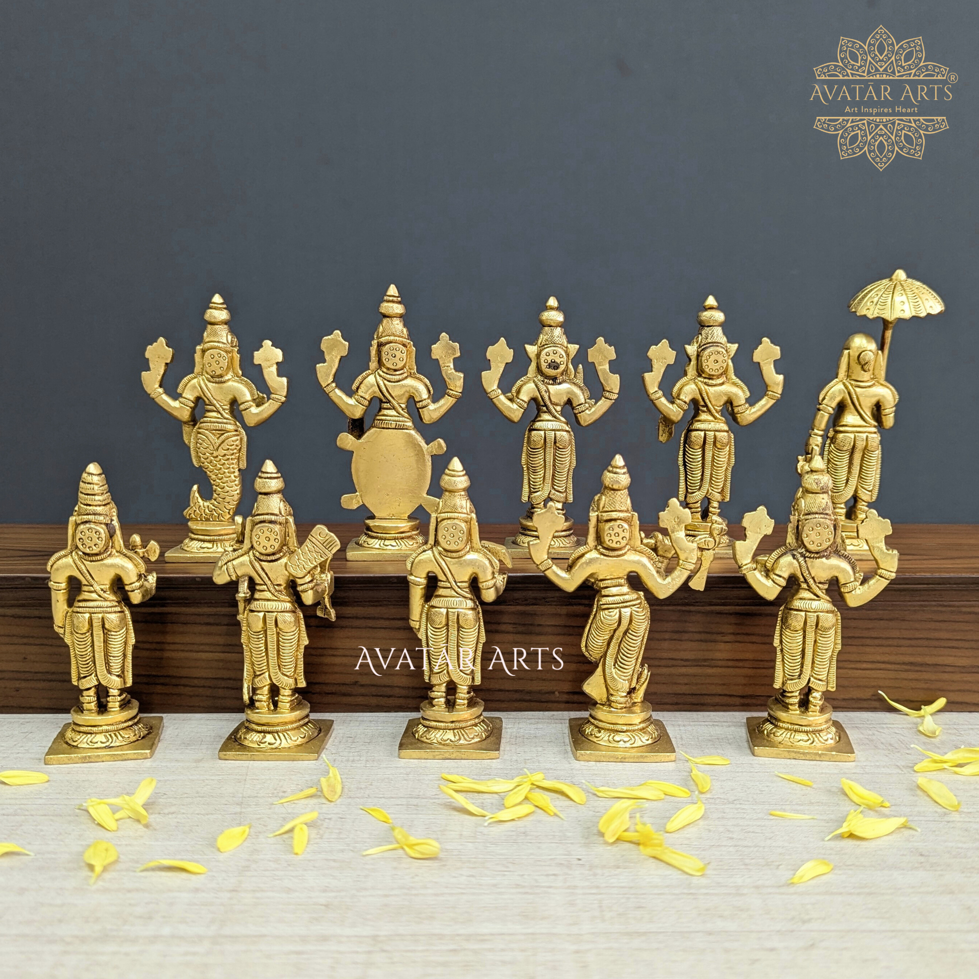 The Dashavatar brass statues set beautifully represents the ten divine incarnations of Lord Vishnu, symbolizing the preservation of cosmic balance and the victory of dharma over adharma. This complete set of 10 Dashavatar idols, though small in size, showcases remarkable detailing, fine proportions, and expressive craftsmanship. Each statue is meticulously handcrafted by skilled Indian artisans using premium-quality brass, ensuring durability, rich finish, and timeless appeal. Perfect for home temples, pooja rooms, shelves, or as a spiritual home décor statement, this collection reflects the finest workmanship and traditional Indian artistry.