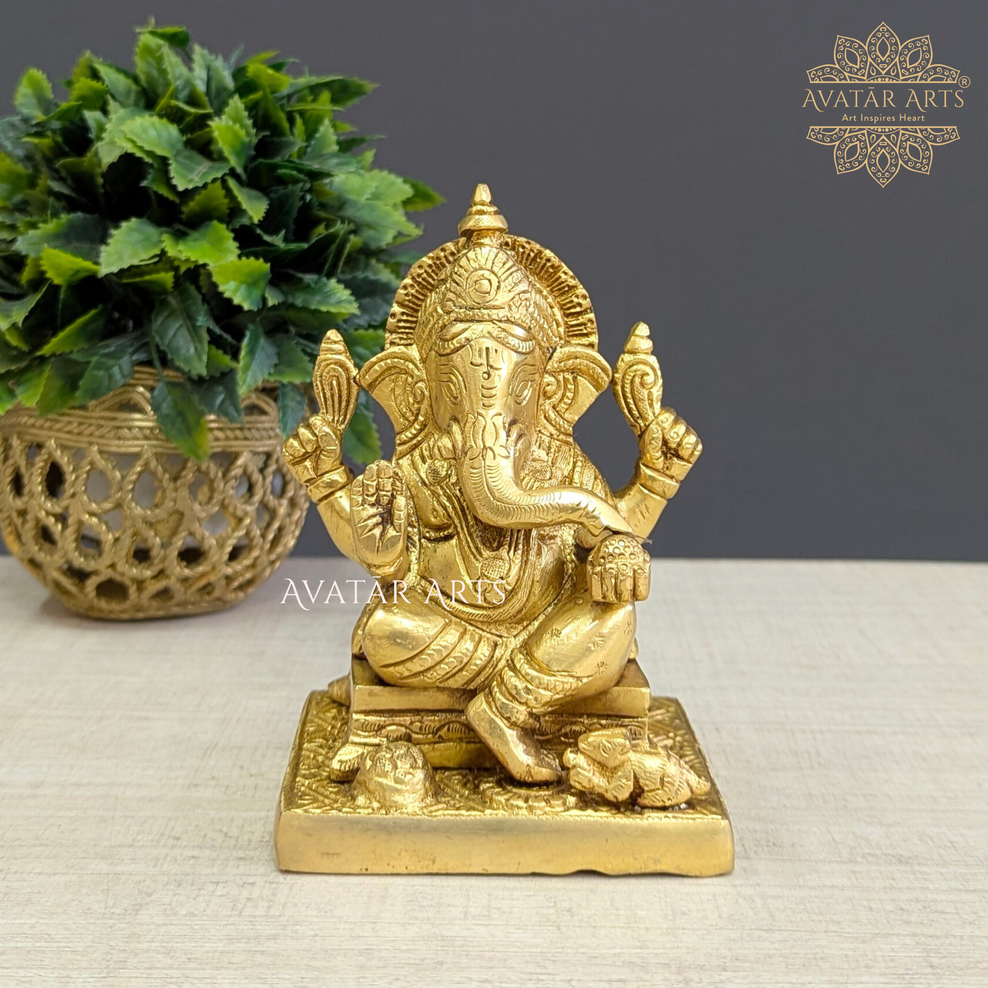 Bring home divine grace and timeless craftsmanship with this beautiful brass idol of Lord Ganesha, seated gracefully on a traditional chowki with one leg down, symbolising comfort, approachability, and readiness to bless devotees. Meticulously handcrafted by skilled Indian artisans, this idol showcases best quality brass, fine detailing, and superior workmanship, making it a perfect blend of devotion and home décor. Lord Ganesha in this posture is believed to remove obstacles, bring wisdom, prosperity, and success, making it ideal for daily pooja, home temples, offices, and festive decor. Its auspicious presence also makes it a thoughtful choice for handmade gifts, corporate gifts, housewarming, weddings, and festive gifting. A timeless addition to your home décor collection, this brass Ganesha radiates positivity, tradition, and elegance while enhancing your space with divine energy.