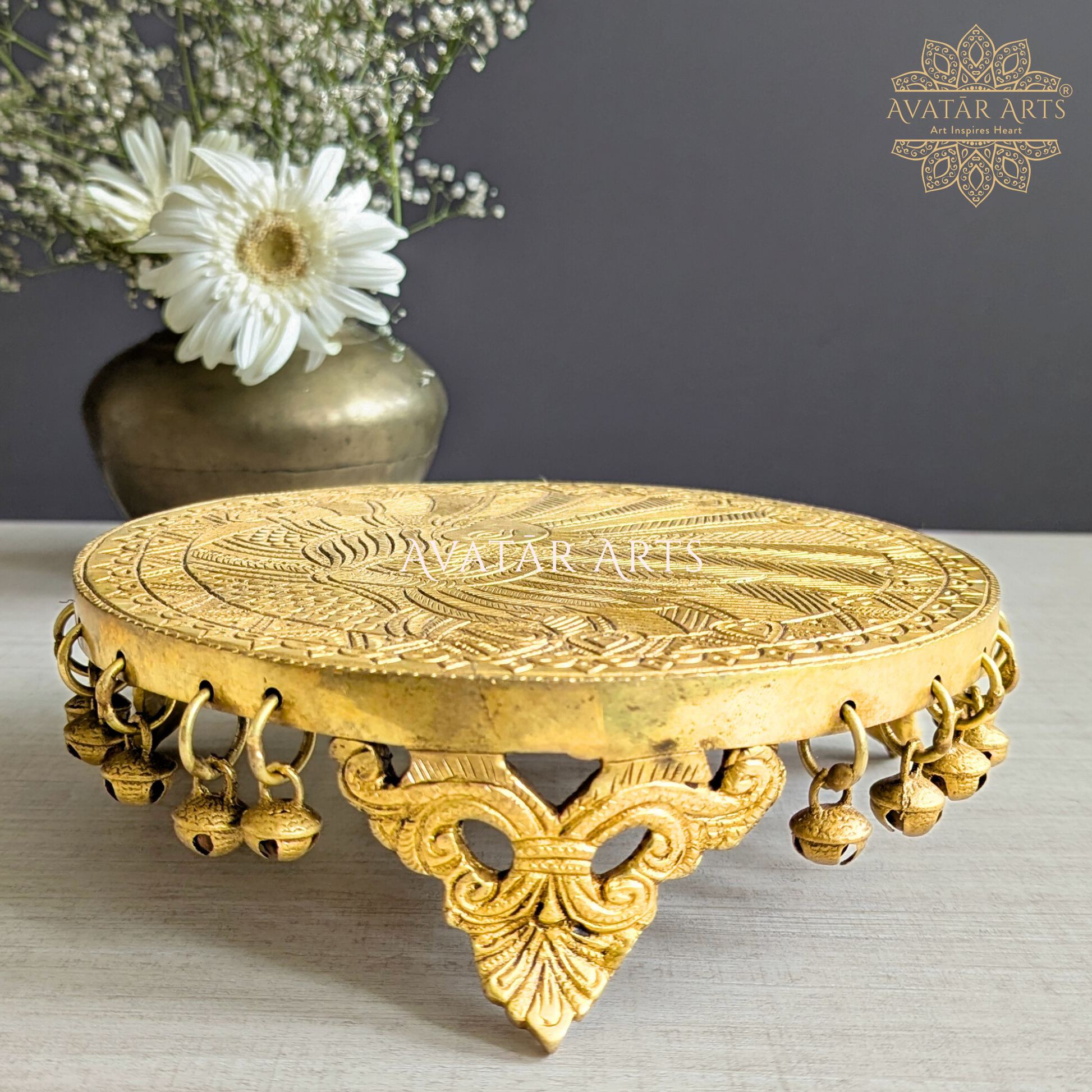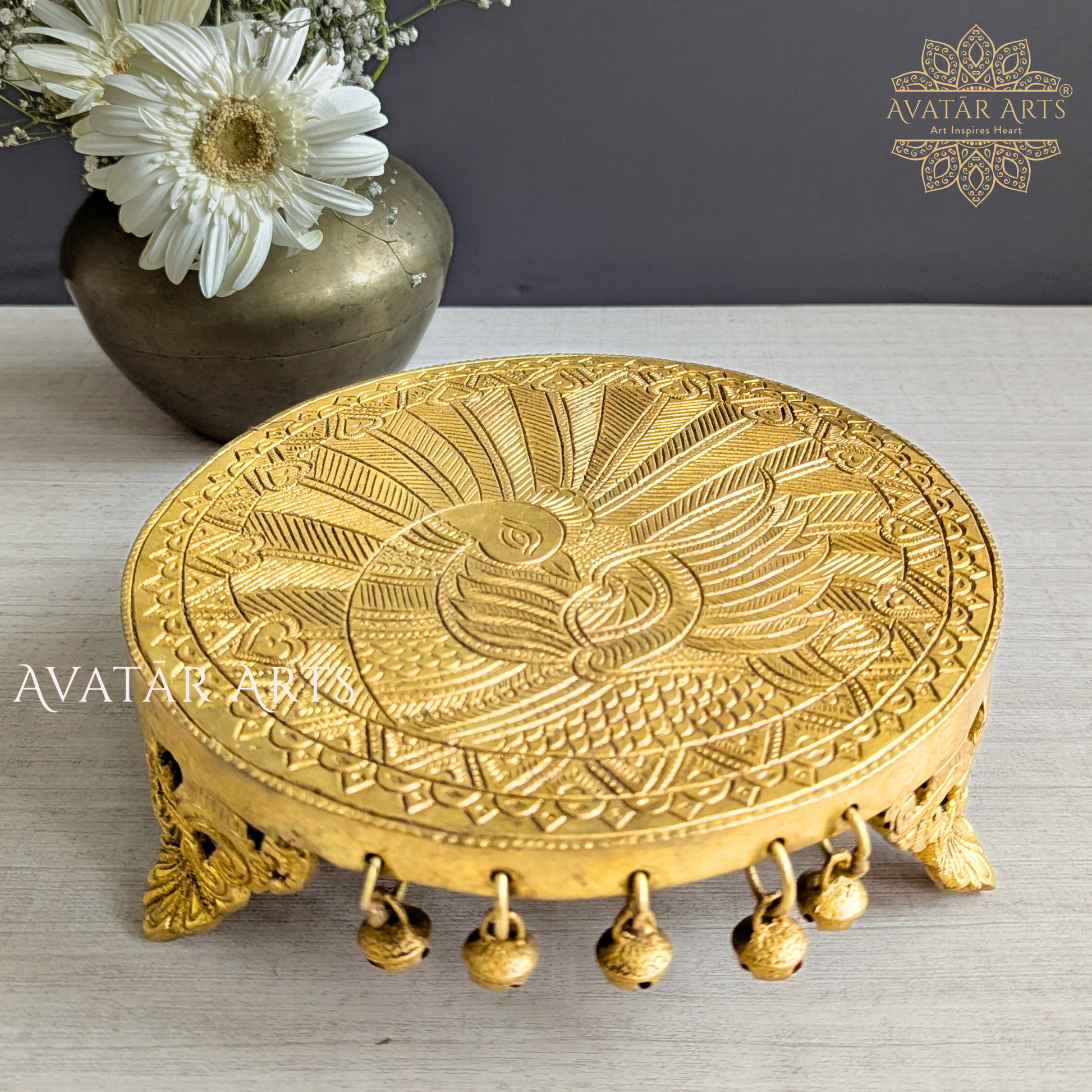 Bring home the elegance of traditional artistry with this beautifully handcrafted brass Peetha. Designed in a classic round shape with intricate peacock carvings, this pedestal rests on three ornate legs and is accented with delicate hanging bells all around, enhancing its visual appeal. Whether you use it to place your favourite deity idol, a decorative urli, or any showpiece, this brass chowki adds grace and sacredness to any space. Crafted by skilled Indian artisans with best-in-class brass, it’s a perfect addition for pooja rooms or home décor.