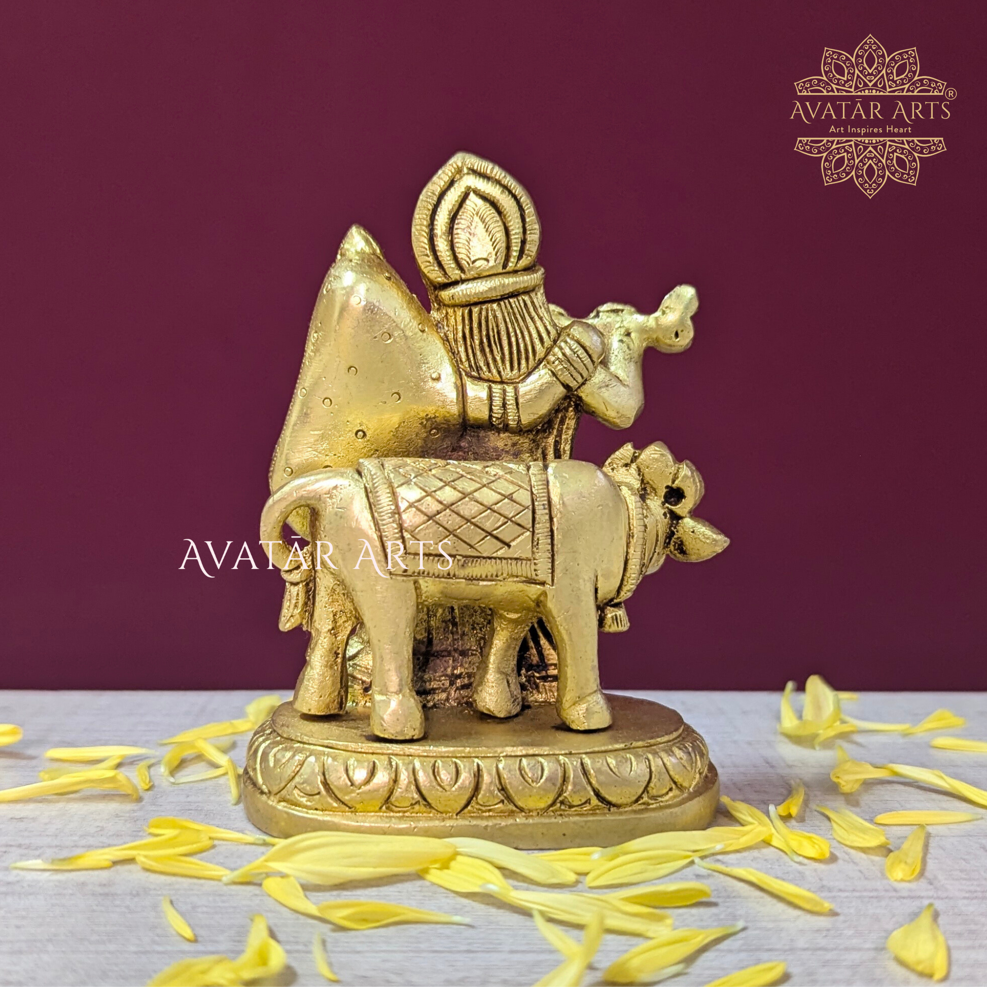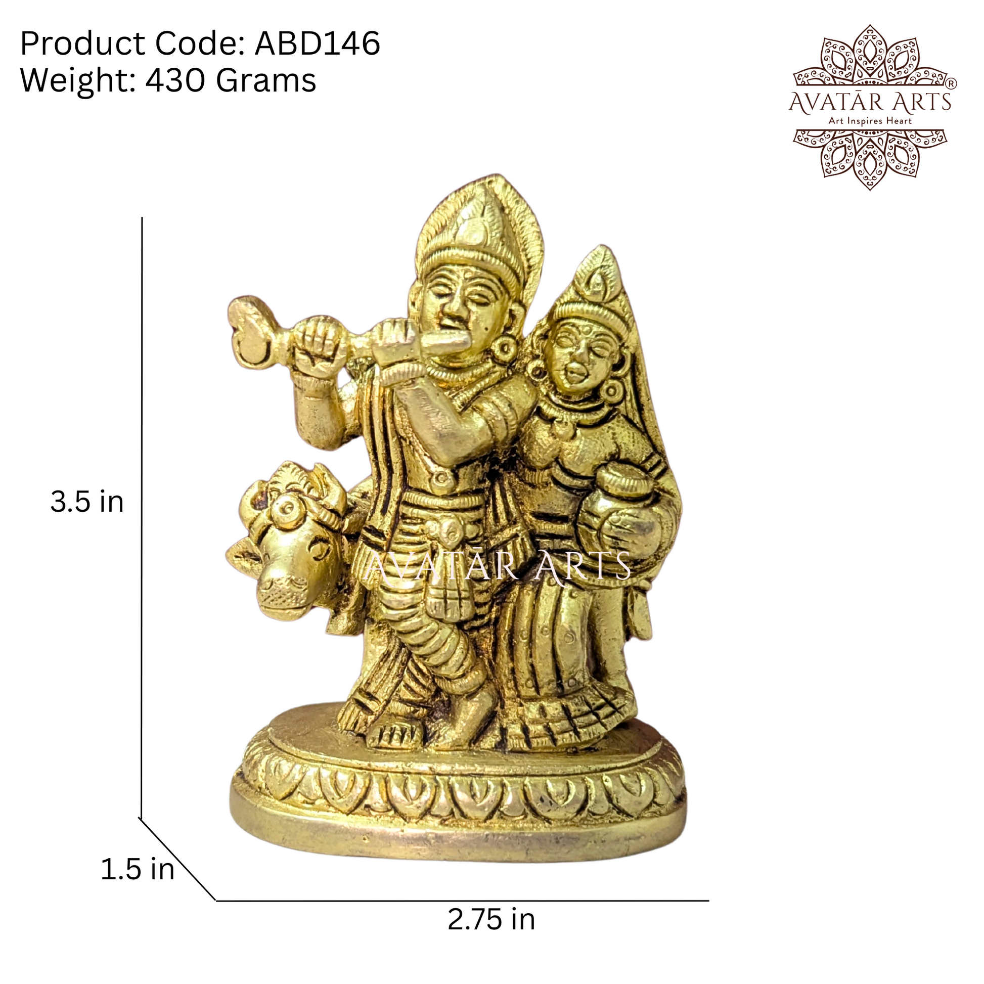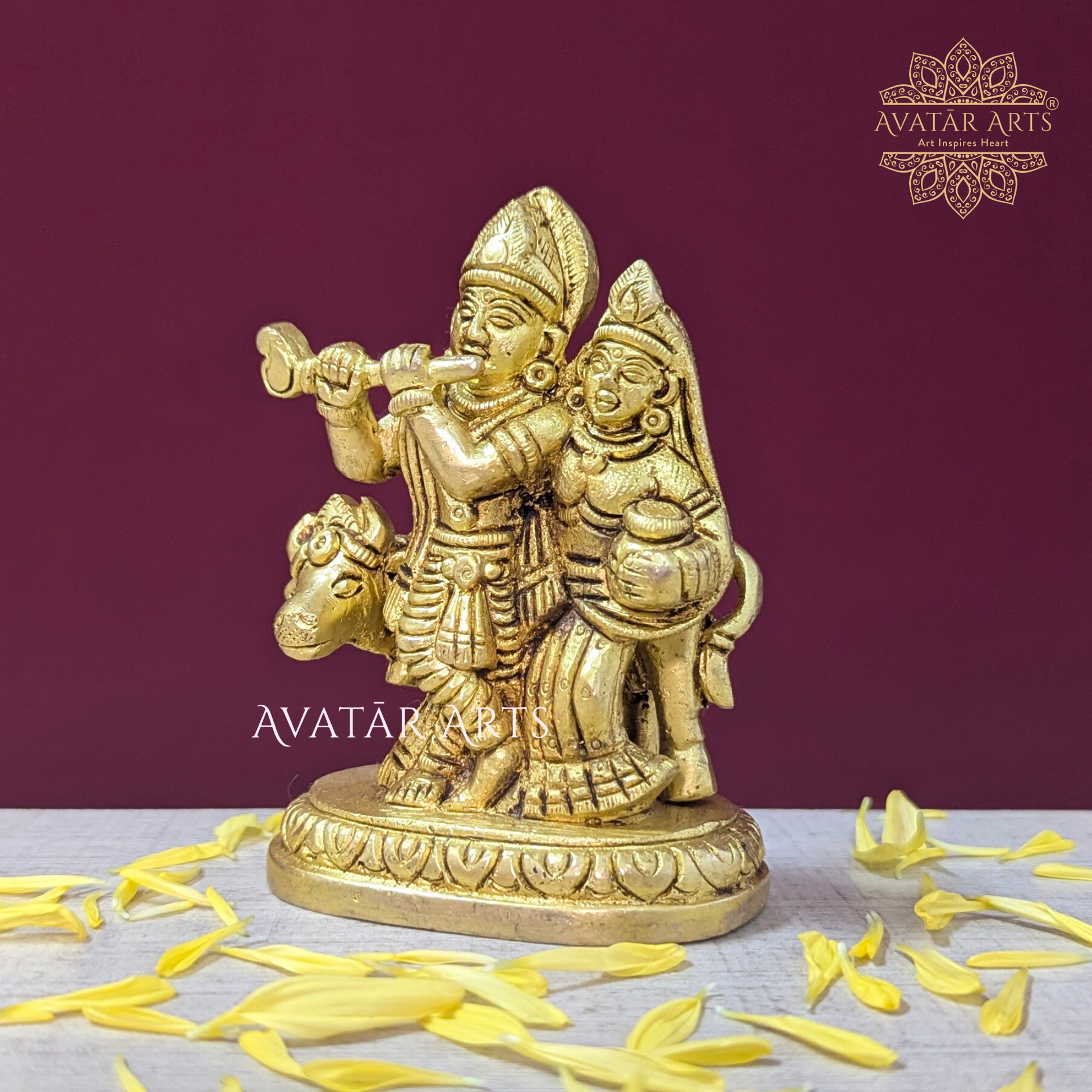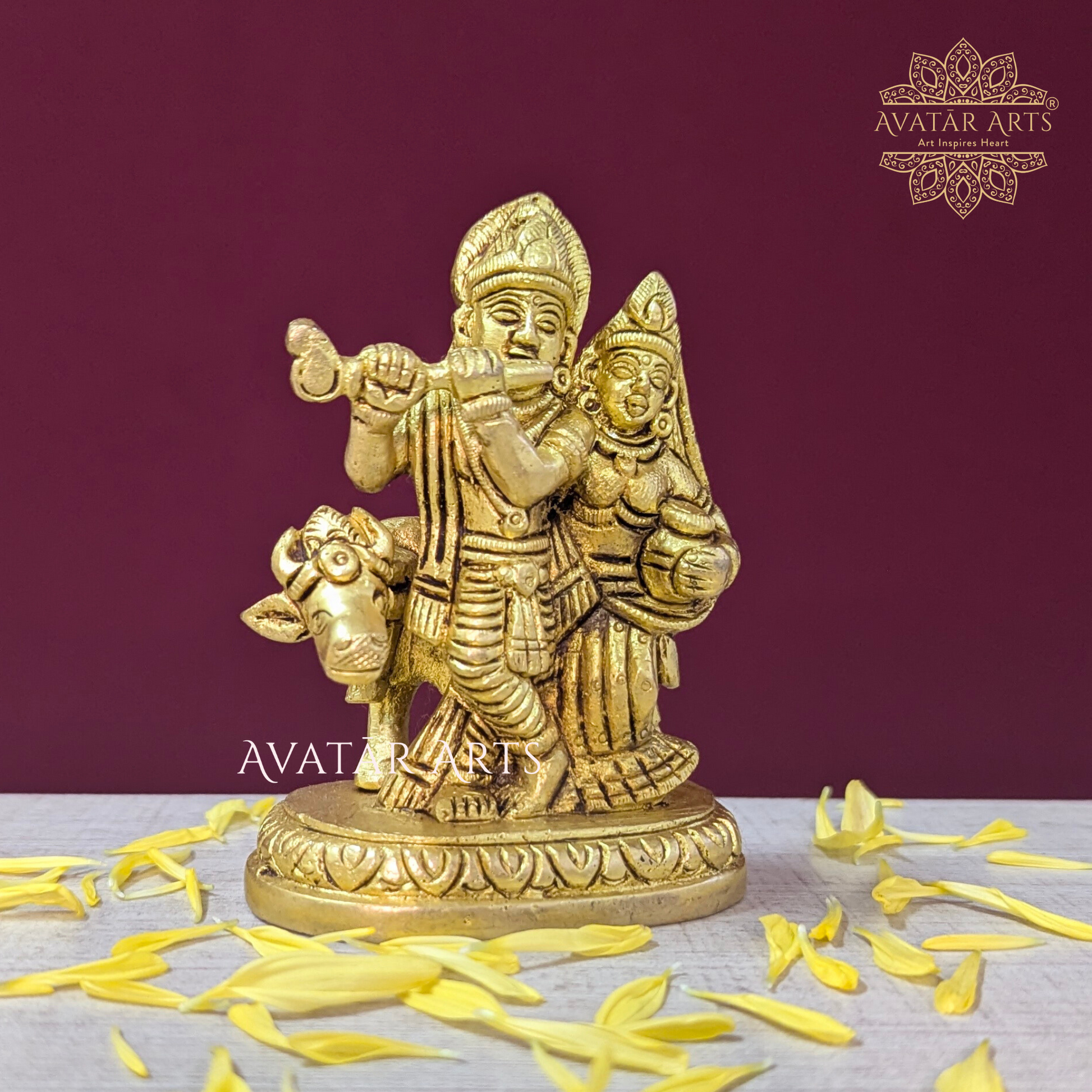 This elegant Shree Radha Krishna with Cow idol is a small yet finely detailed masterpiece, handcrafted in pure brass with the best quality and workmanship; symbolizing divine love, harmony, and prosperity, this compact idol is perfect for daily pooja, enhancing your home décor, or gifting on auspicious occasions, making it a timeless piece of traditional Indian artistry that radiates devotion and grace.