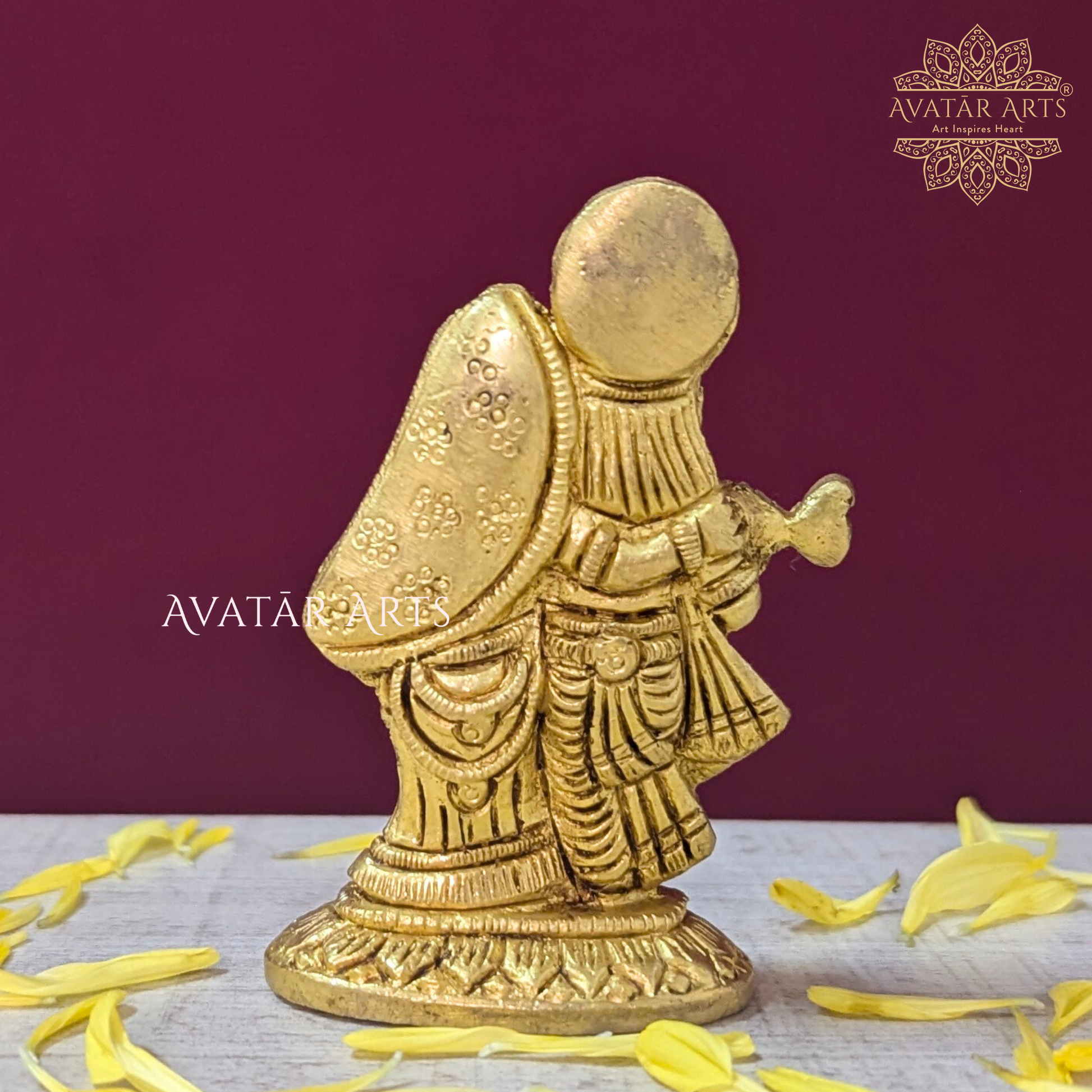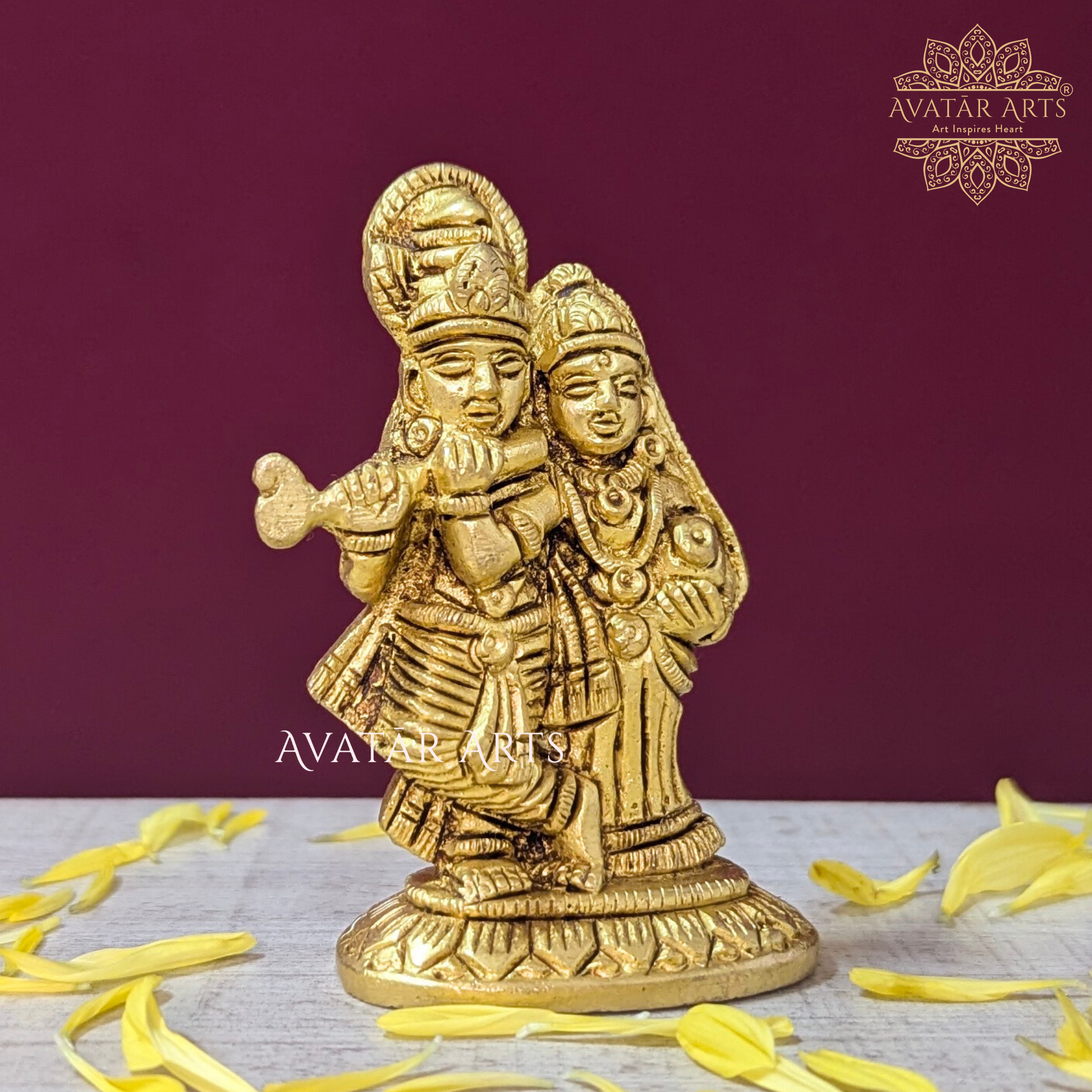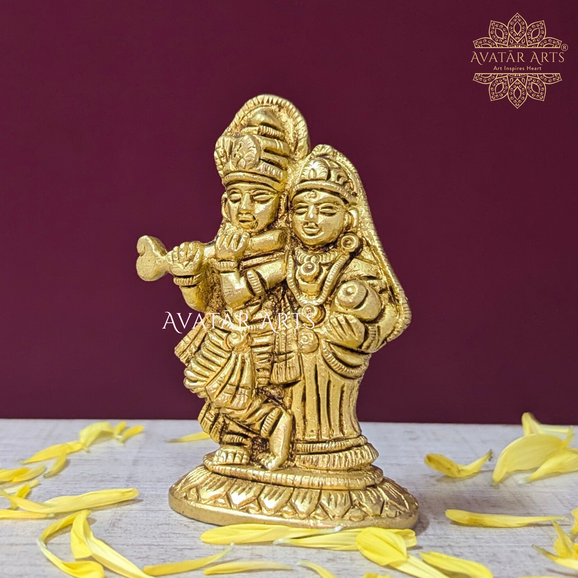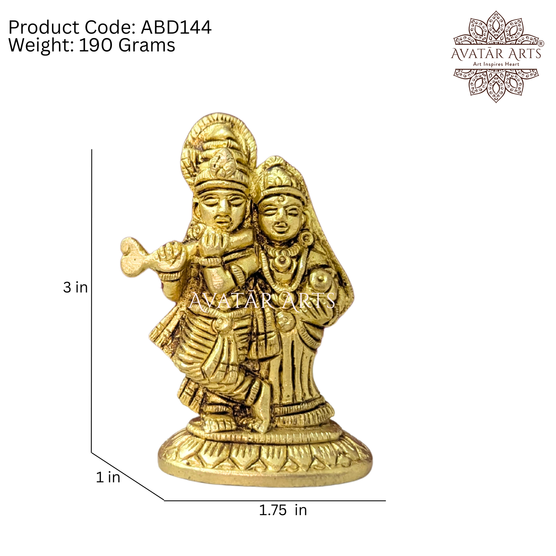 This beautifully handcrafted Shree Radha Krishna idol made of pure brass is a small yet intricately detailed piece that reflects the eternal bond of love and devotion between Radha and Krishna; created with the best quality and fine workmanship, it is ideal for daily pooja, enhancing your home décor with a touch of divinity, or gifting on special occasions like weddings, housewarmings, and festivals, making it a cherished symbol of traditional Indian artistry and spiritual grace.