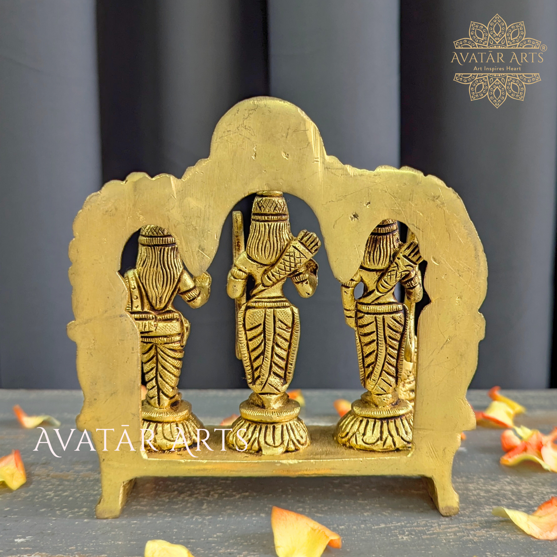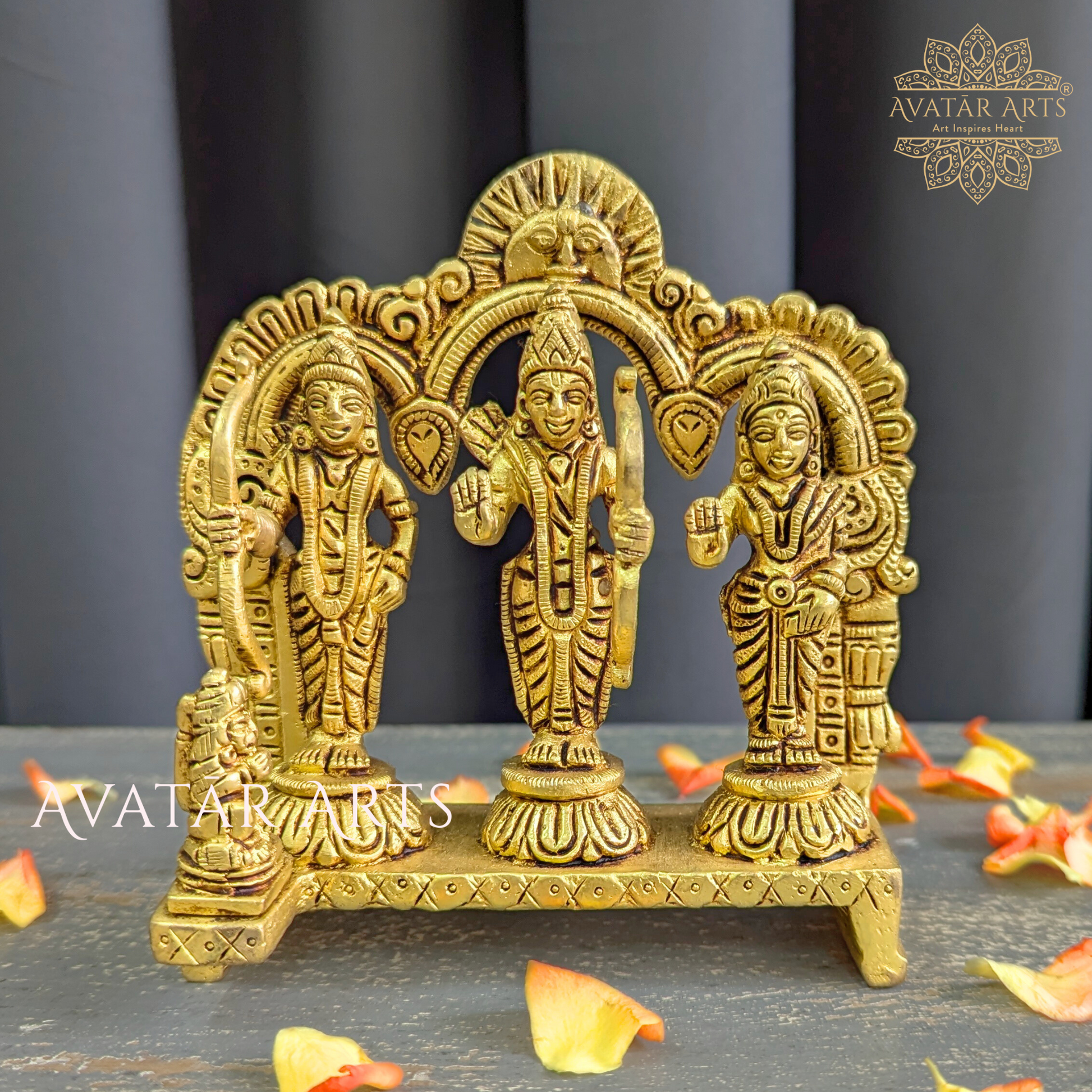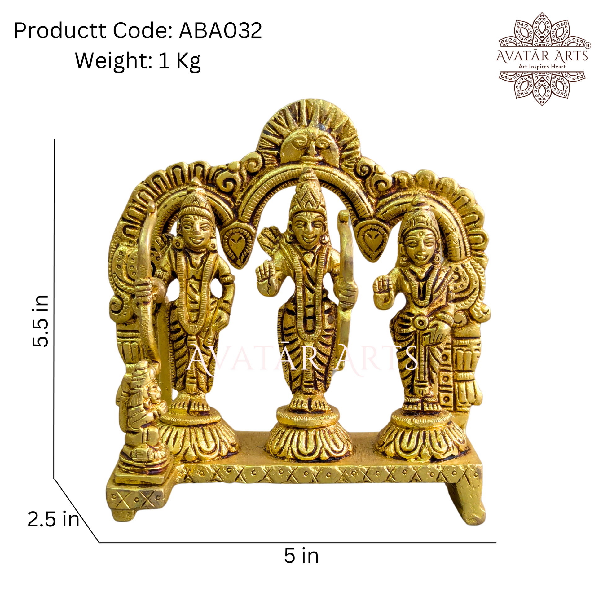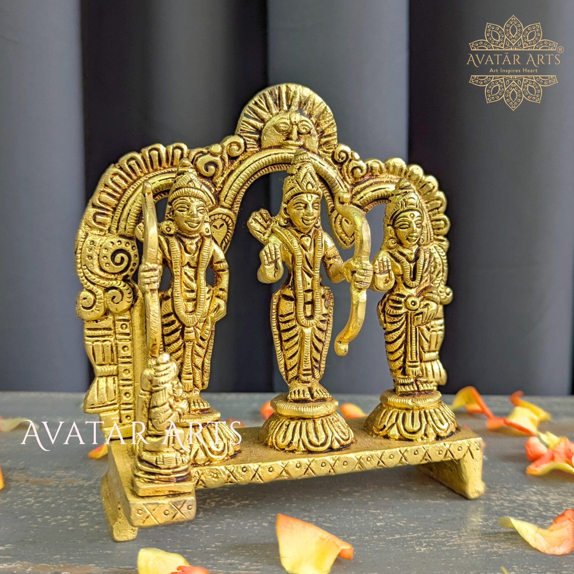 This brass idol of Shree Ram Darbaar showcases the divine figures of Lord Ram, Sita, Lakshman, and Hanuman standing together on a common pedestal, symbolizing unity and devotion. Above them, an arch features Lord Surya, highlighting Lord Ram's Suryavanshi heritage. The craftsmanship is exquisite, reflecting the skill and dedication of the artisans. Lord Ram is celebrated for his unwavering truthfulness, compassion, and sense of duty. Worshiping him encourages us to embody these values in our daily lives, guiding us toward righteousness and moral integrity.