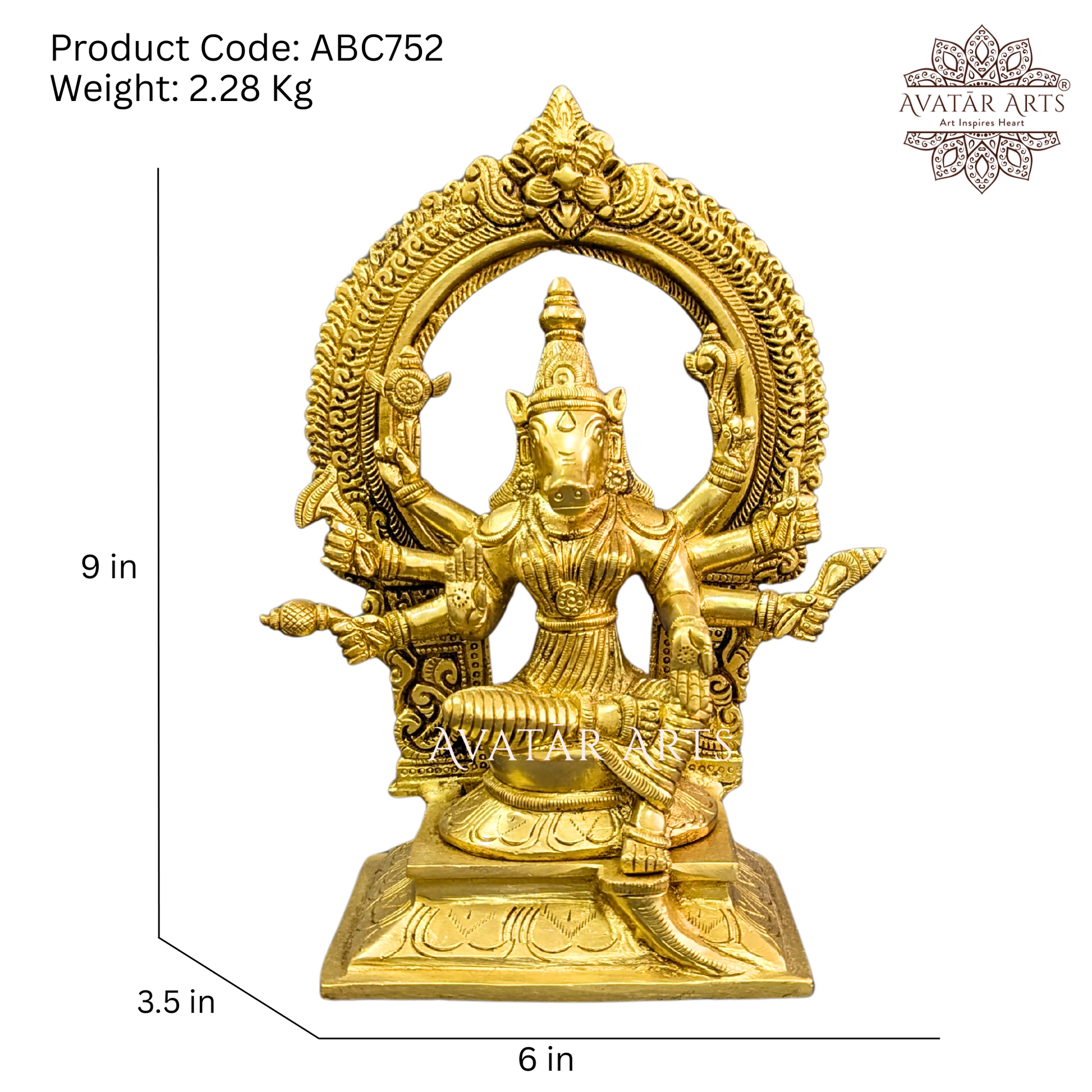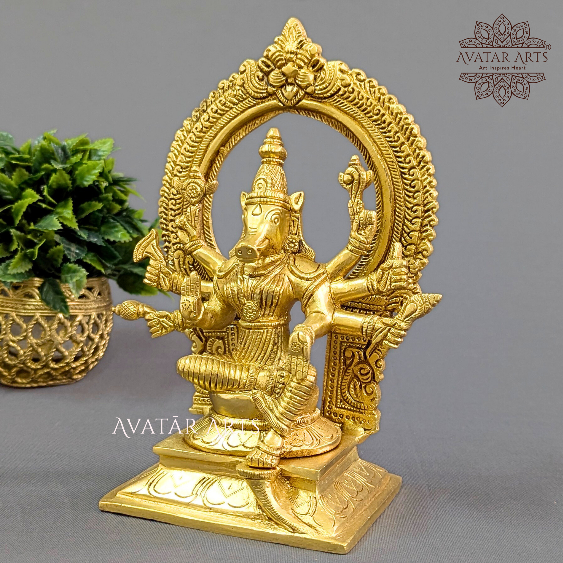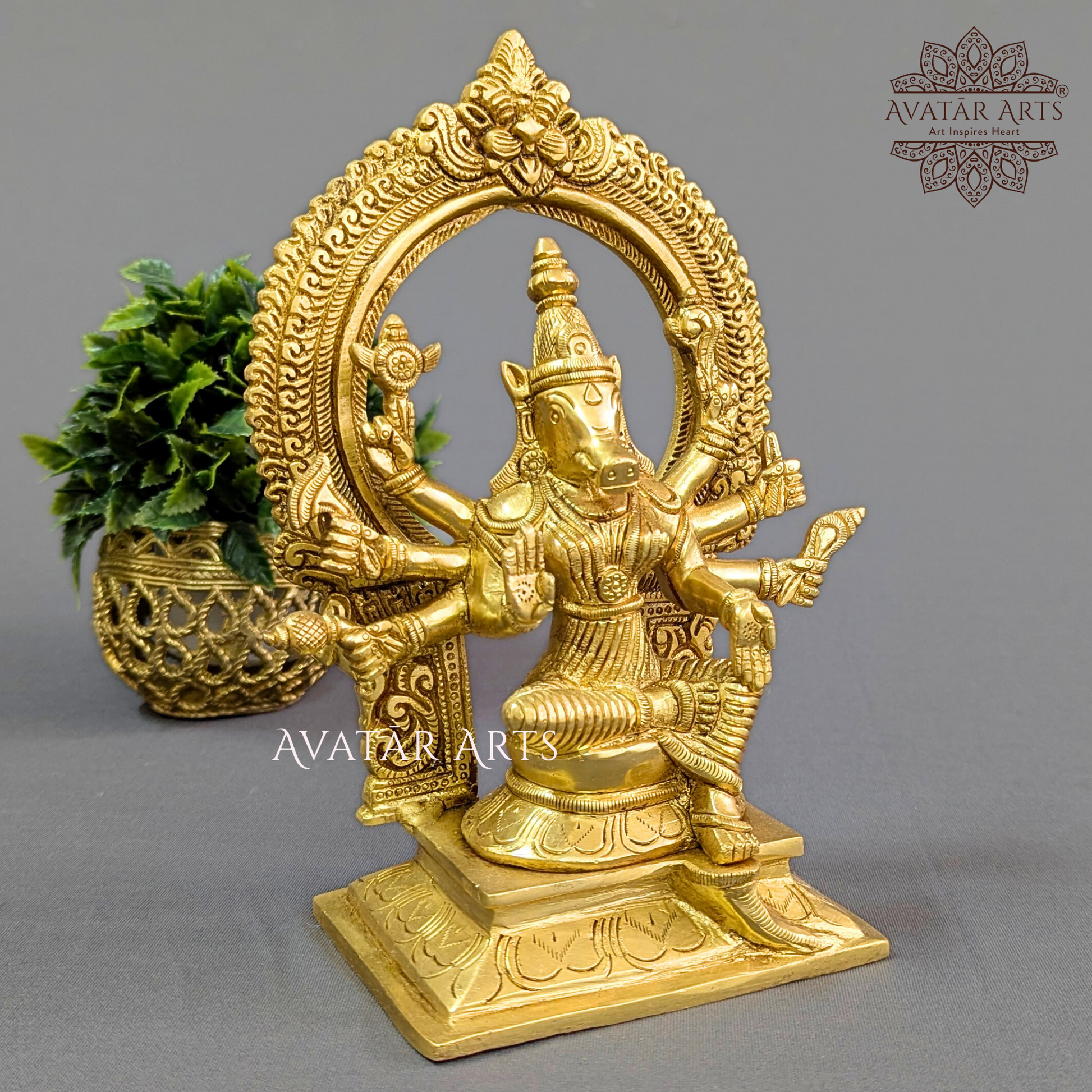 This beautifully crafted idol of Goddess Varahi, made of the finest quality brass with a temple-style arch, reflects exquisite workmanship and flawless finish. Goddess Varahi, one of the Sapta Matrikas, is revered as the divine mother who blesses her devotees with strength, protection, wisdom, and prosperity. Worshipping her daily helps remove obstacles, safeguard the household from negative energies, and bring harmony and abundance into life. This brass idol is not only a sacred piece for daily puja rituals but also a timeless addition to your traditional Indian home décor collection.