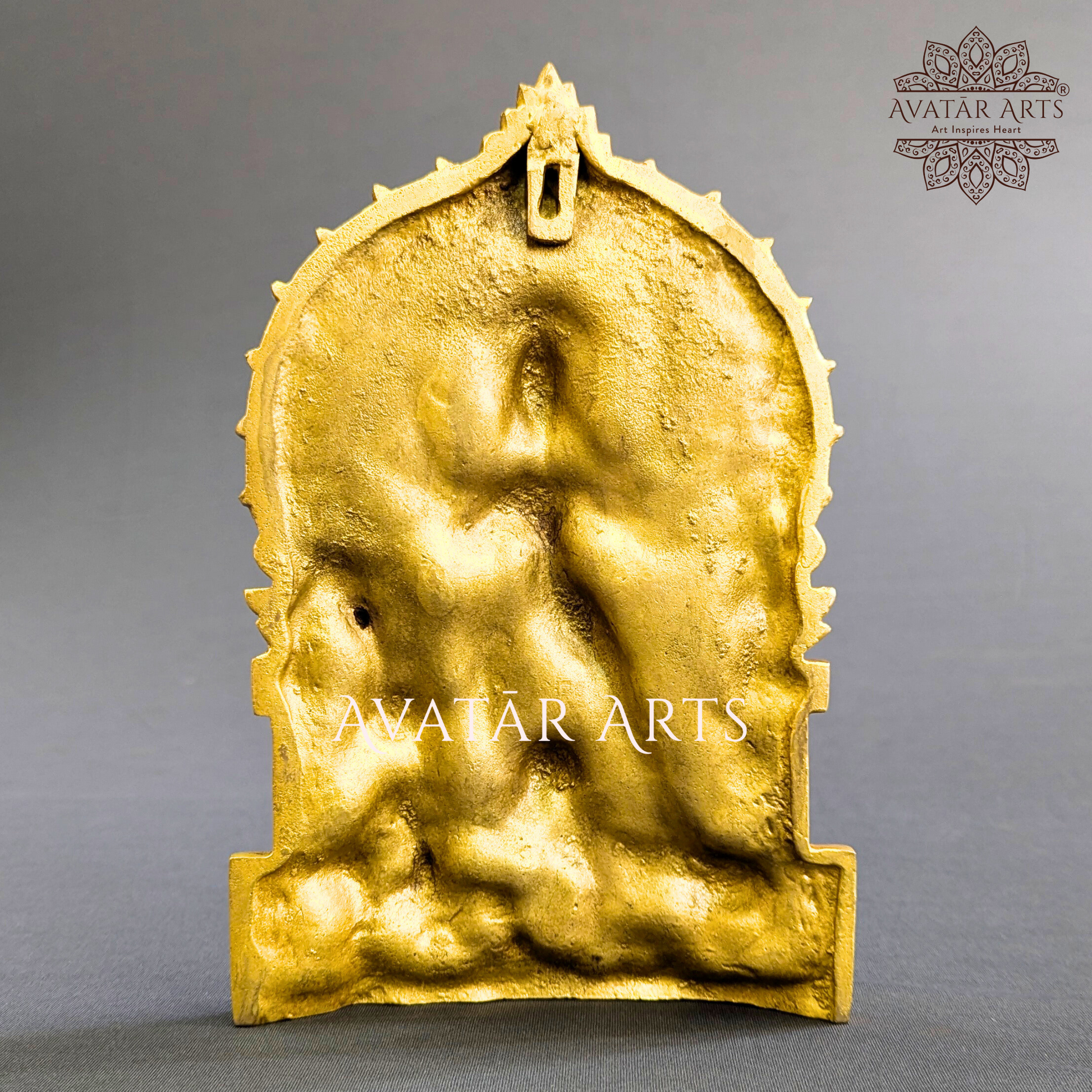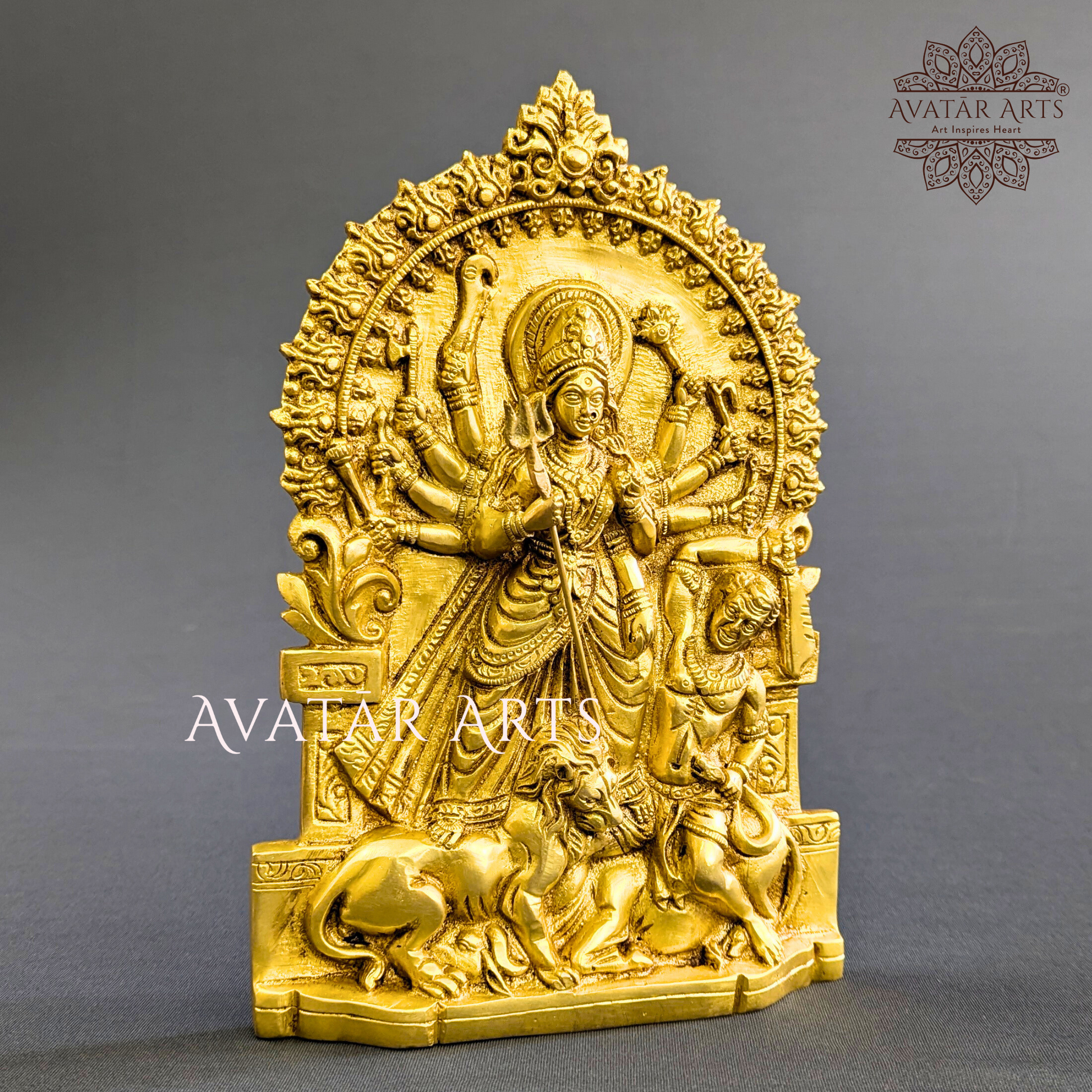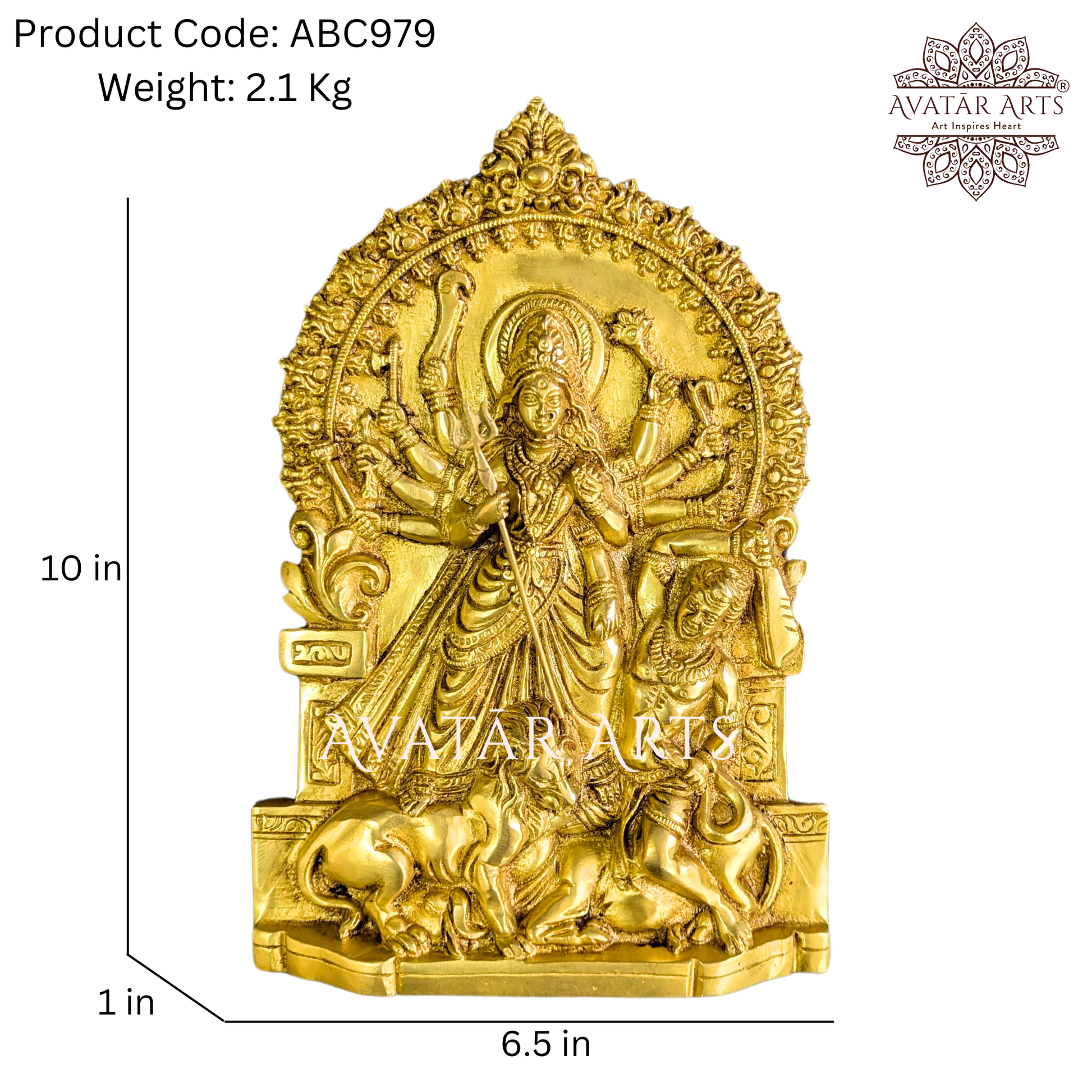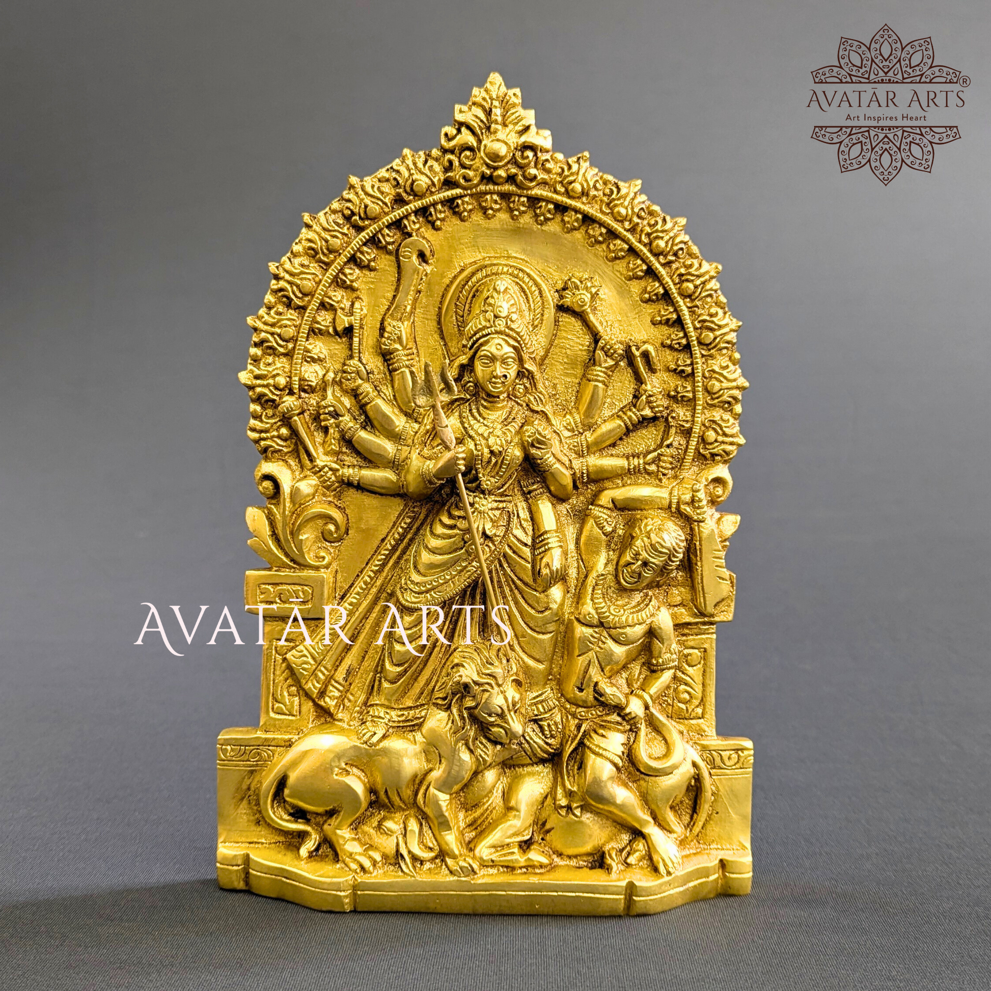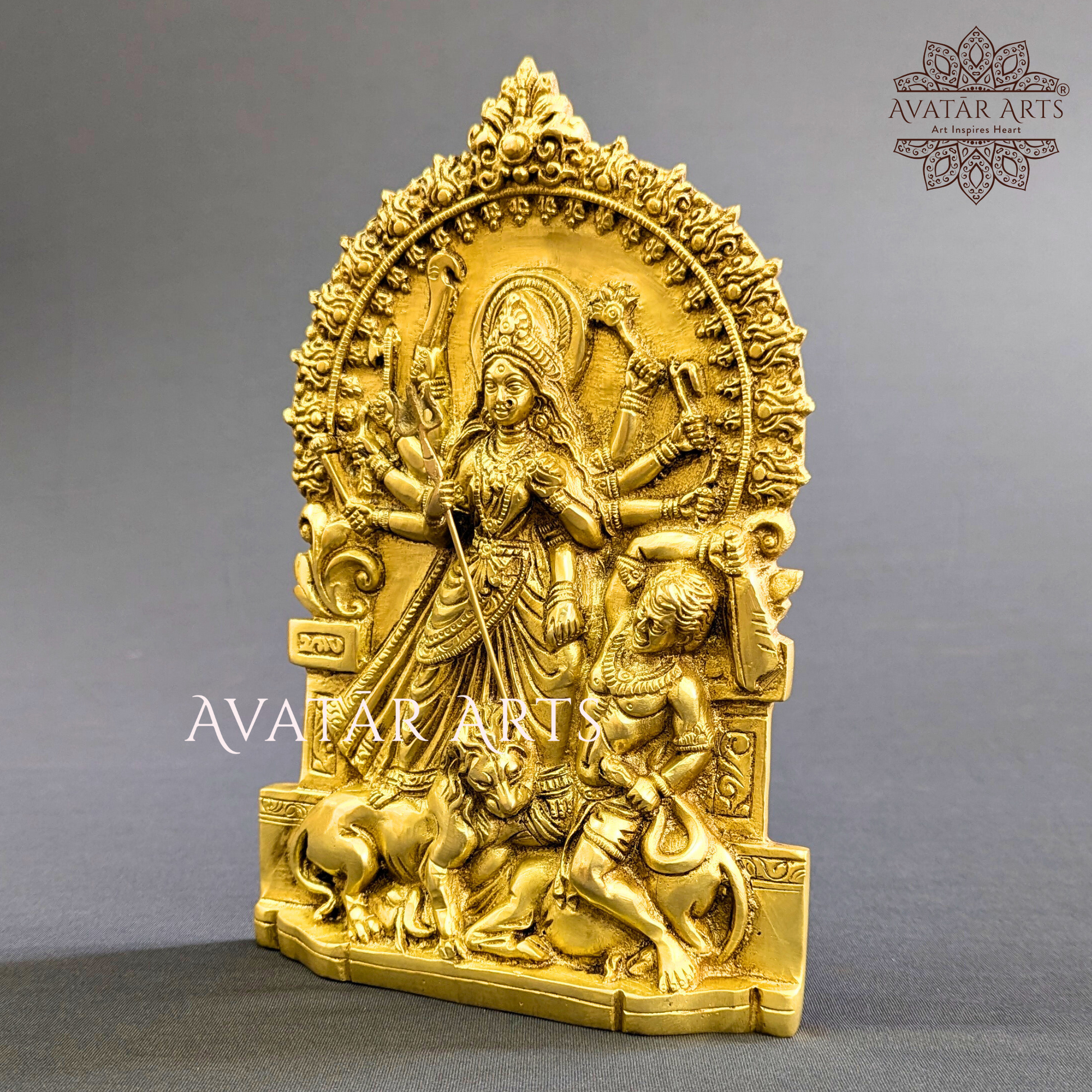 This exquisite wall-mounted brass artifact captures Goddess Durga in her authentic and powerful form, slaying the demon Mahishasura. Crafted with the finest quality and impeccable workmanship, this piece is a perfect blend of artistry and spirituality. Worshipping Goddess Durga symbolizes the victory of good over evil, invoking strength, protection, and prosperity in life. This stunning artifact not only enhances your home décor but also serves as a divine reminder of courage and determination. A timeless masterpiece, it radiates positive energy and spiritual grace.