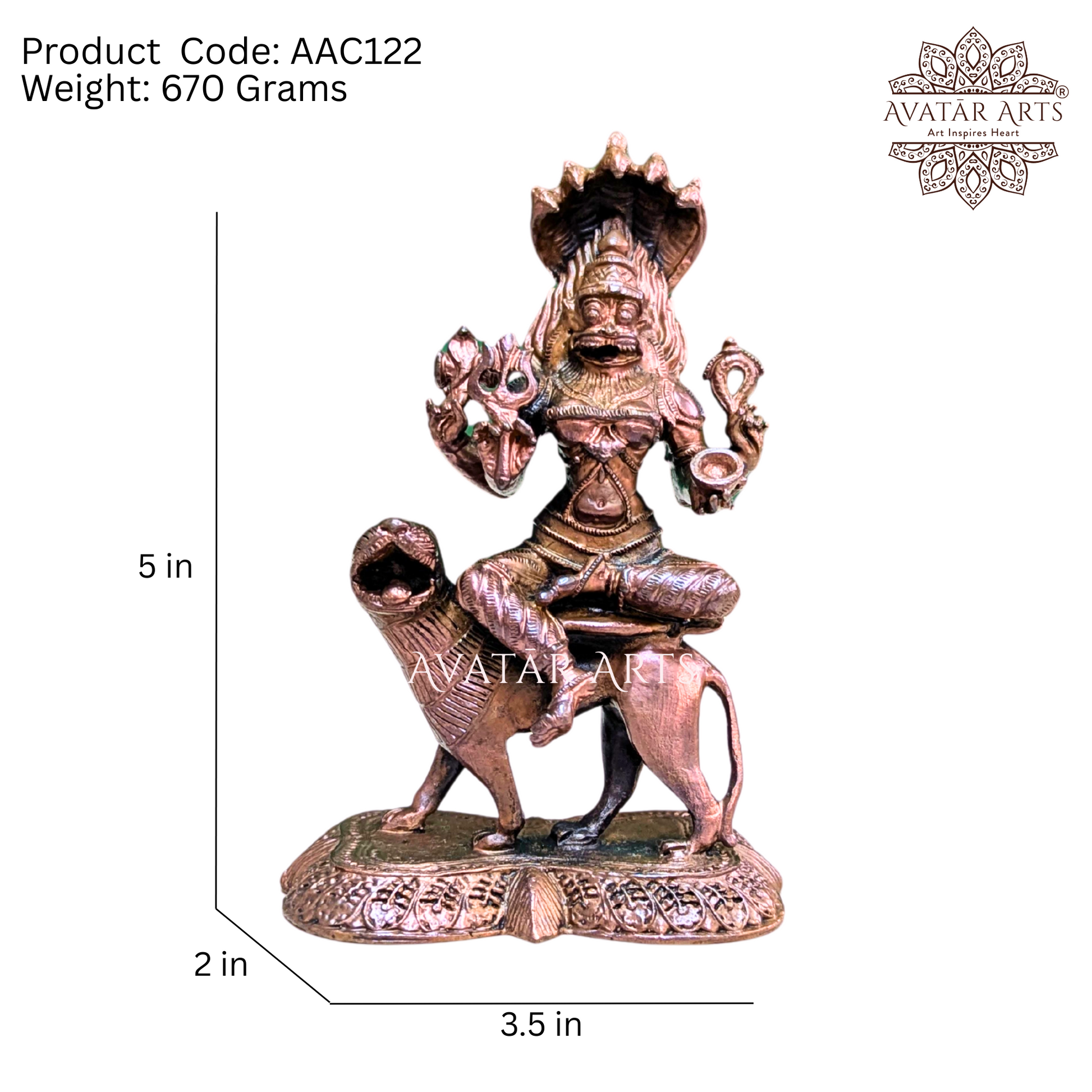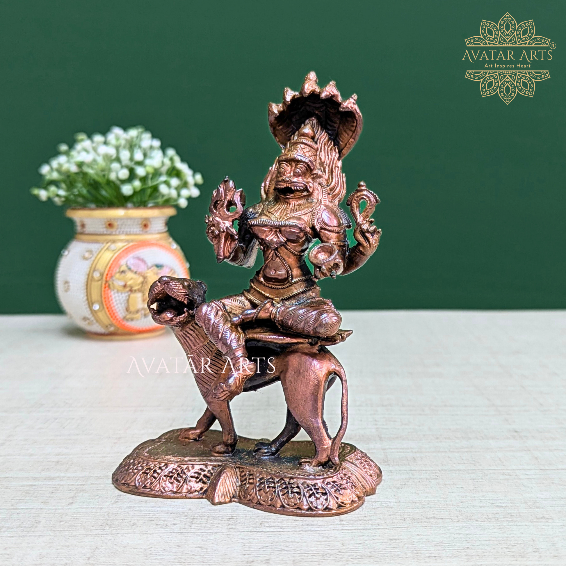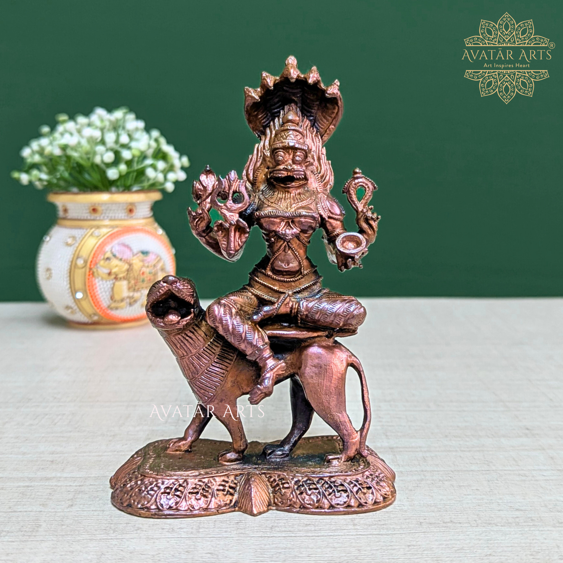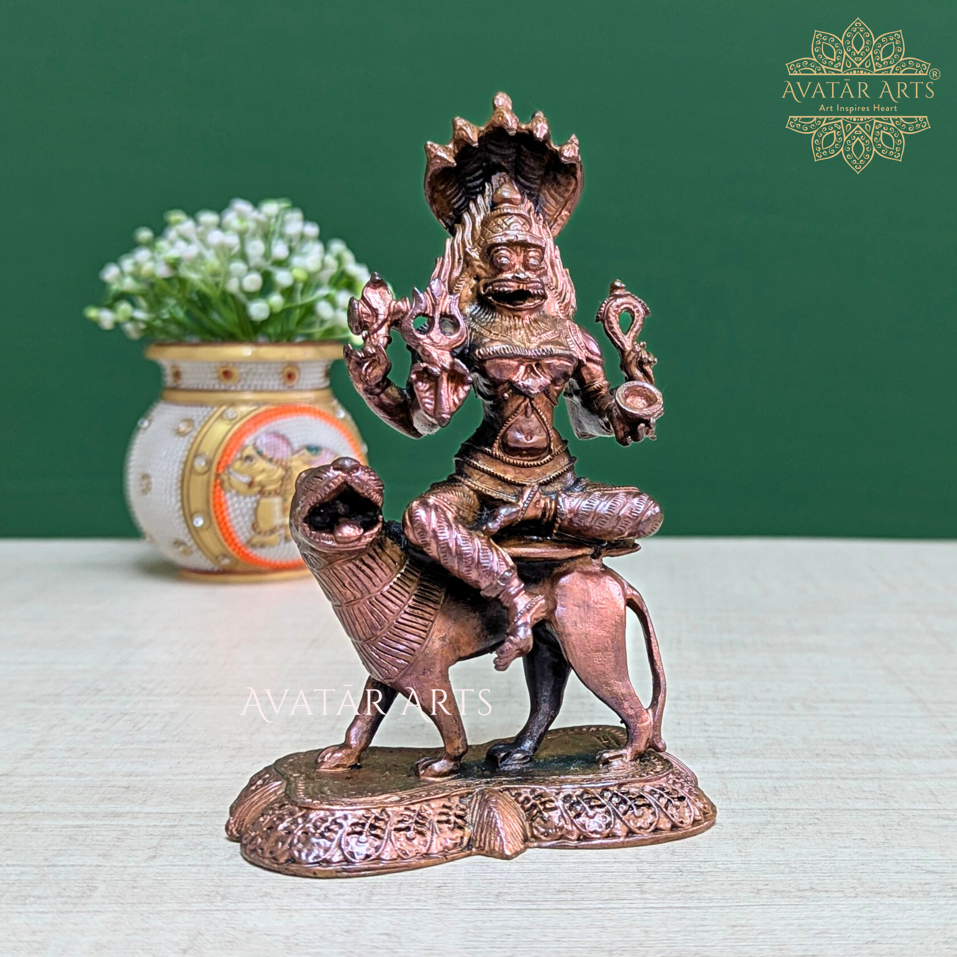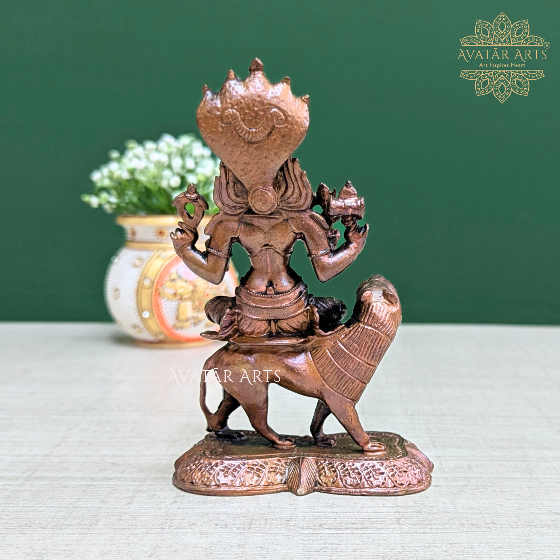This powerful idol of Pratyangira Devi, crafted in high-quality copper with the finest workmanship, is a divine addition for both home decor and spiritual practice. Pratyangira Devi, revered as the fierce and protective form of the Goddess, symbolizes ultimate strength, courage, and the power to destroy negative energies and evil forces. Worshipping Her is believed to ward off black magic, obstacles, and fear, while blessing devotees with peace, protection, and prosperity. An ideal choice for daily Pooja, gifting, or as a sacred artifact, this idol beautifully combines spiritual significance with timeless craftsmanship.