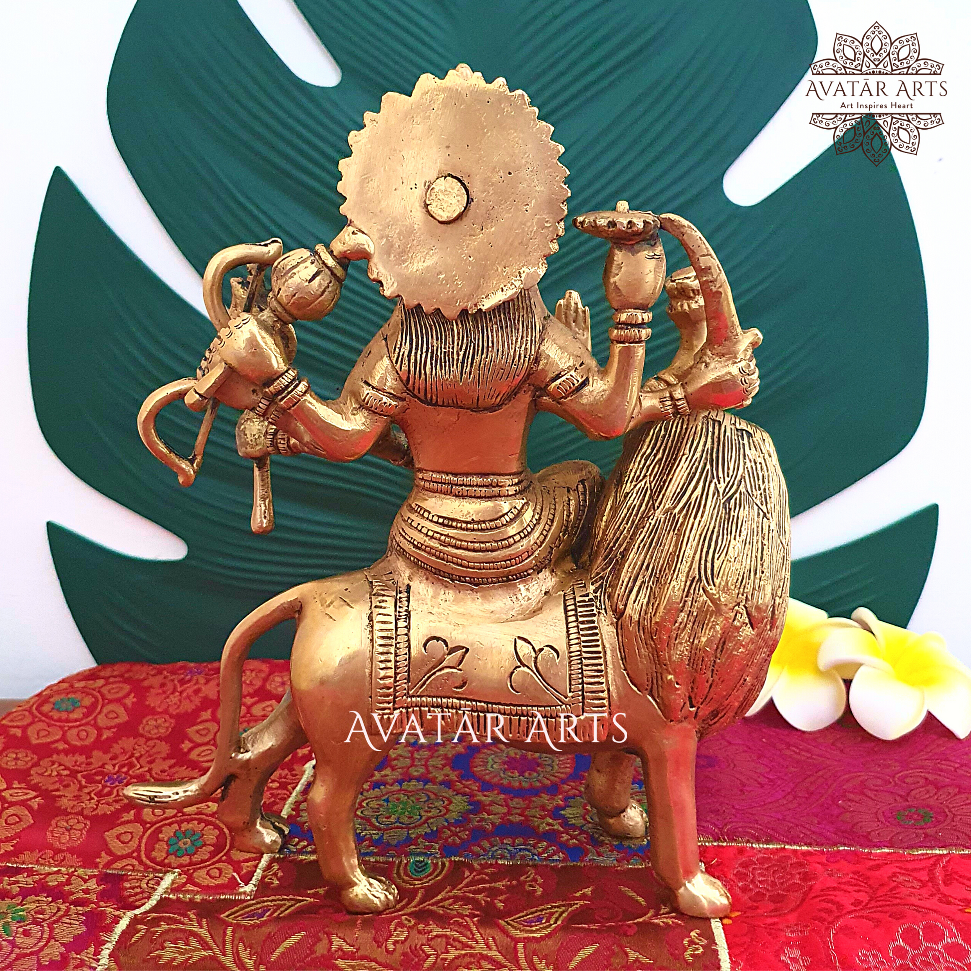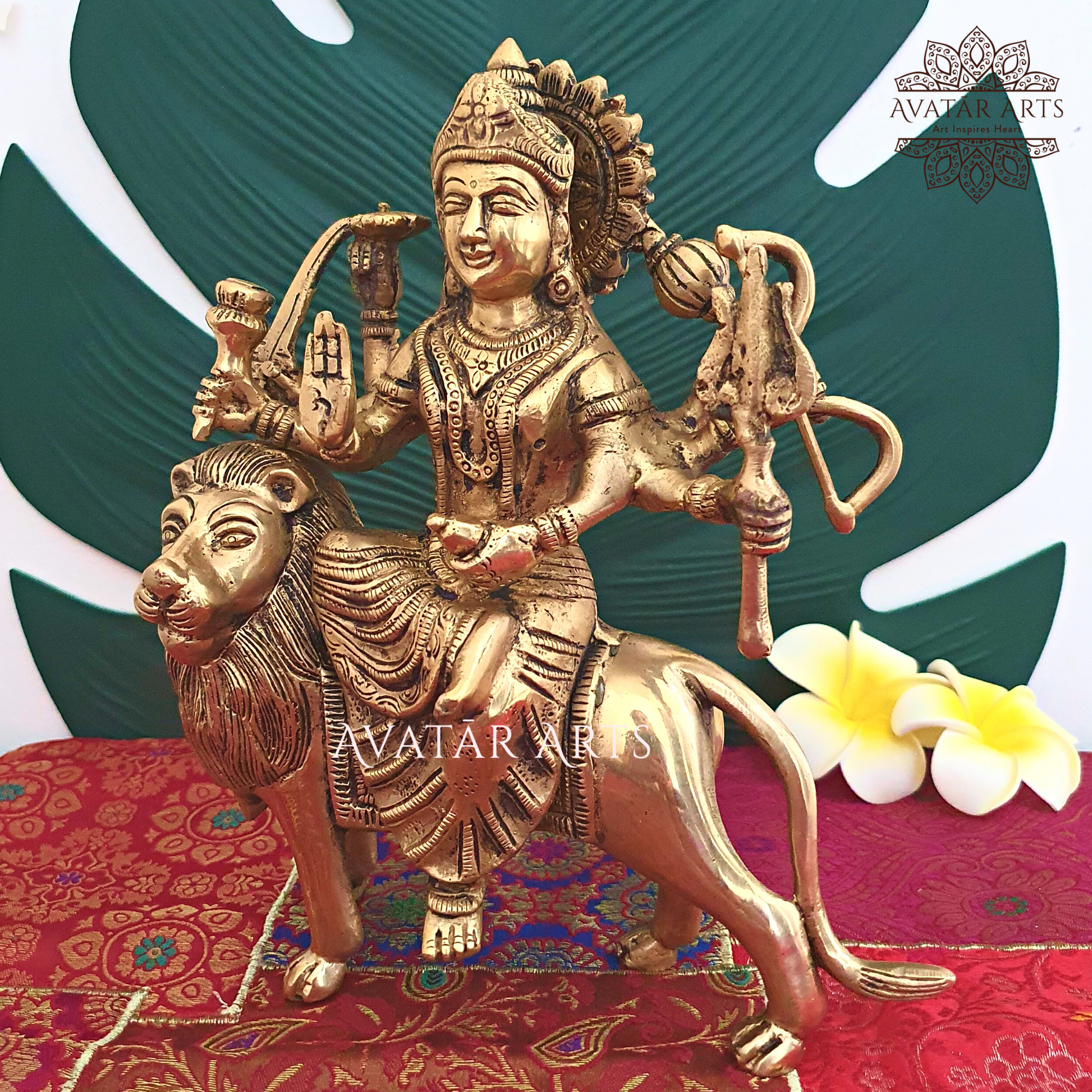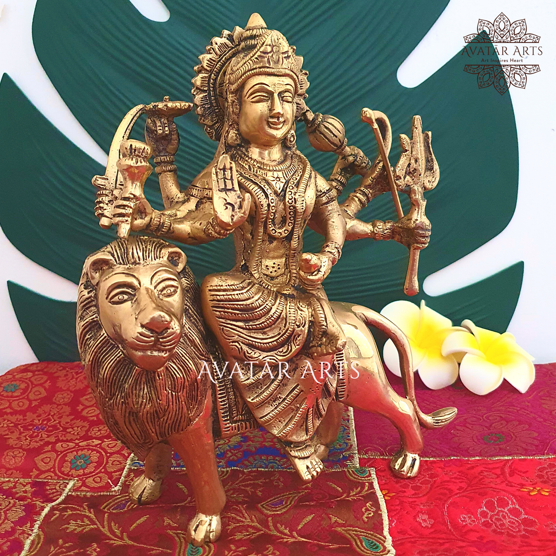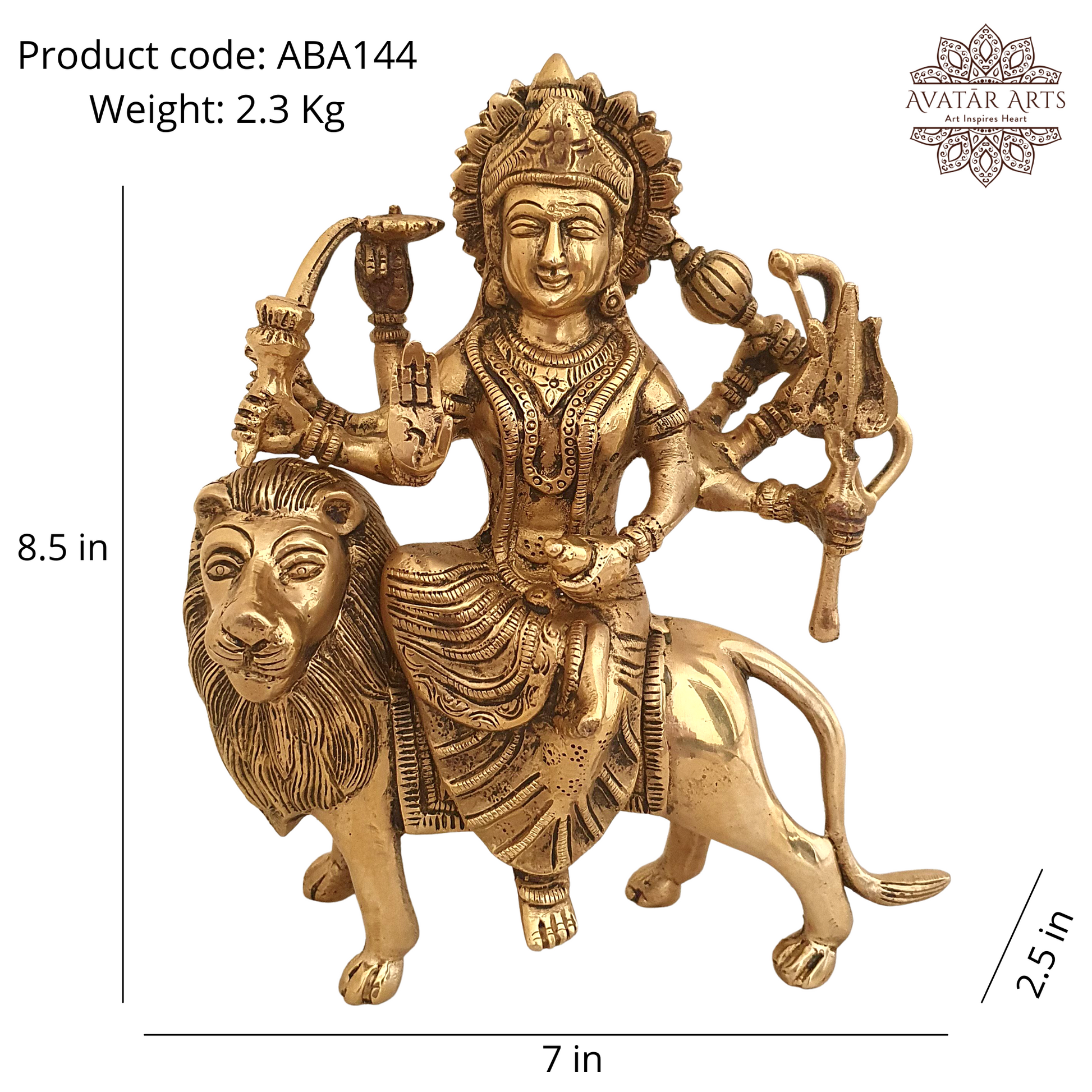 Invoke the blessings of Goddess Durga with this idol which portrays the Goddess standing with a Lion, her Vahana. This idol is genuinely a work of marvel, made of high quality Brass , and handcrafted by talented Indian artisans. Since time immemorial, she has been worshiped as the supreme power of positive energy.