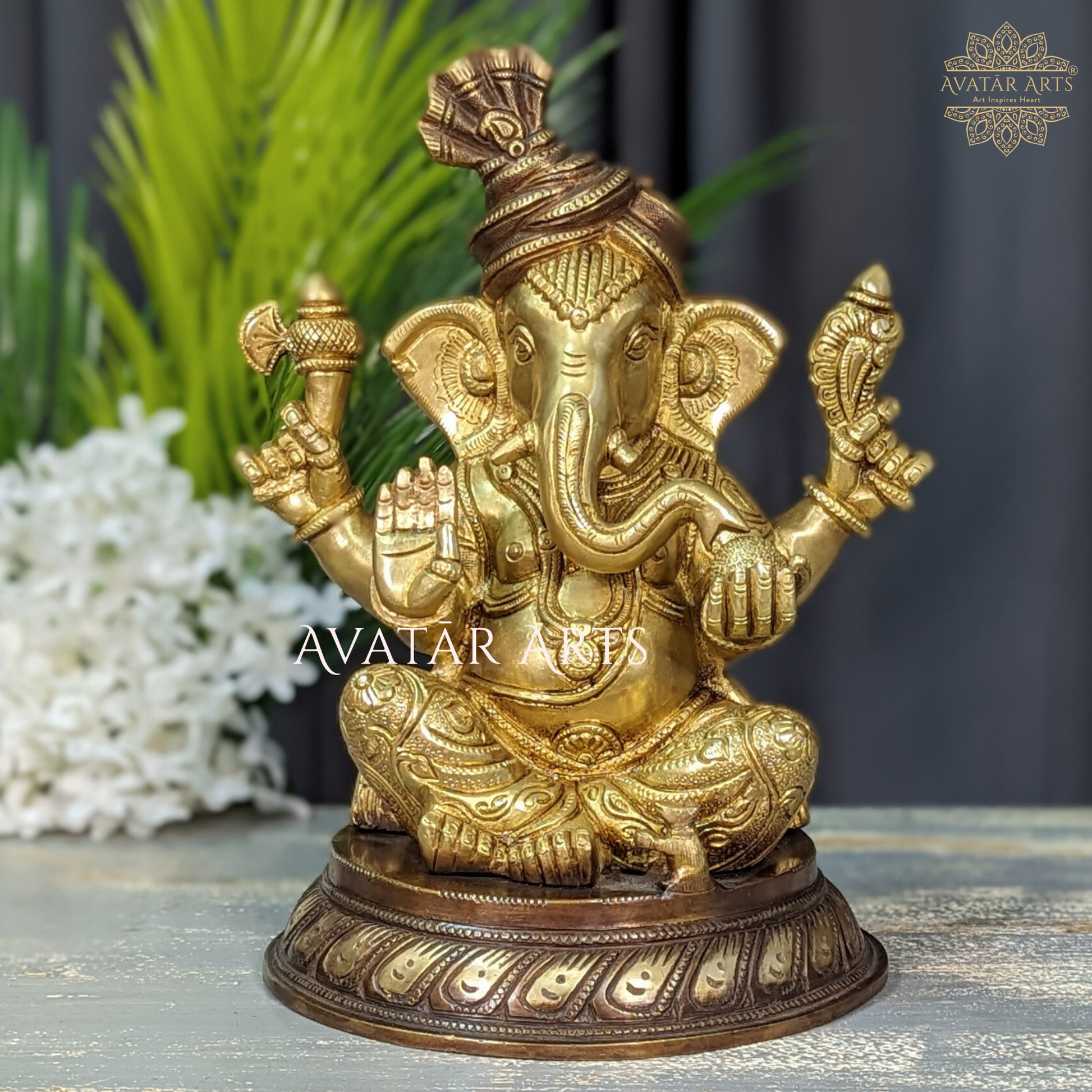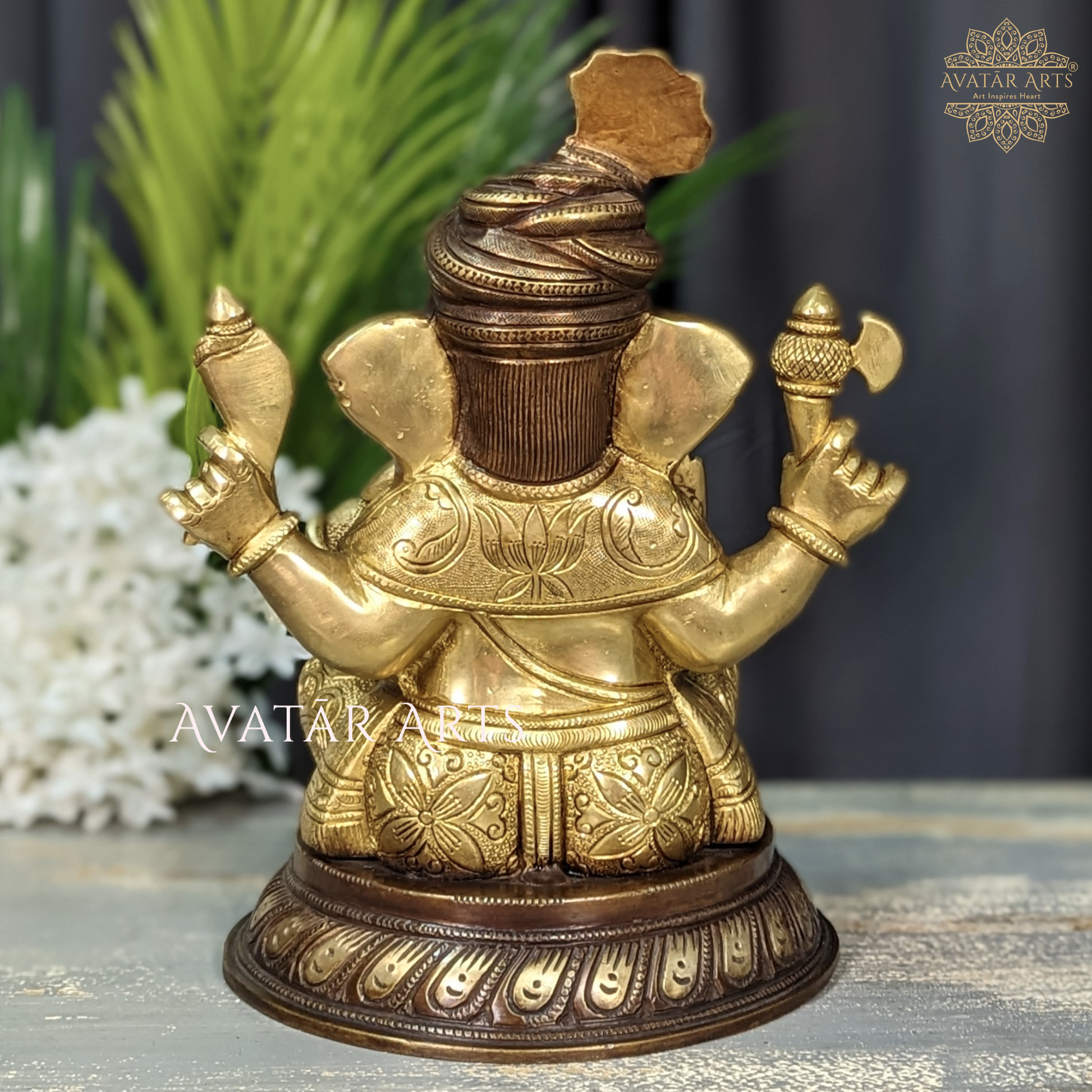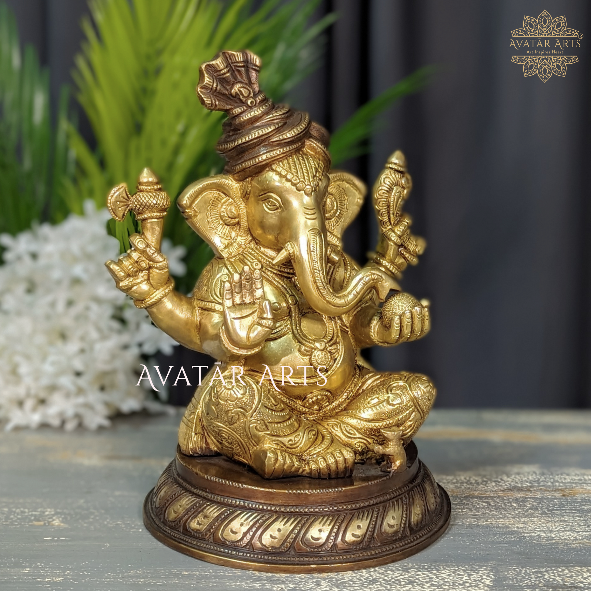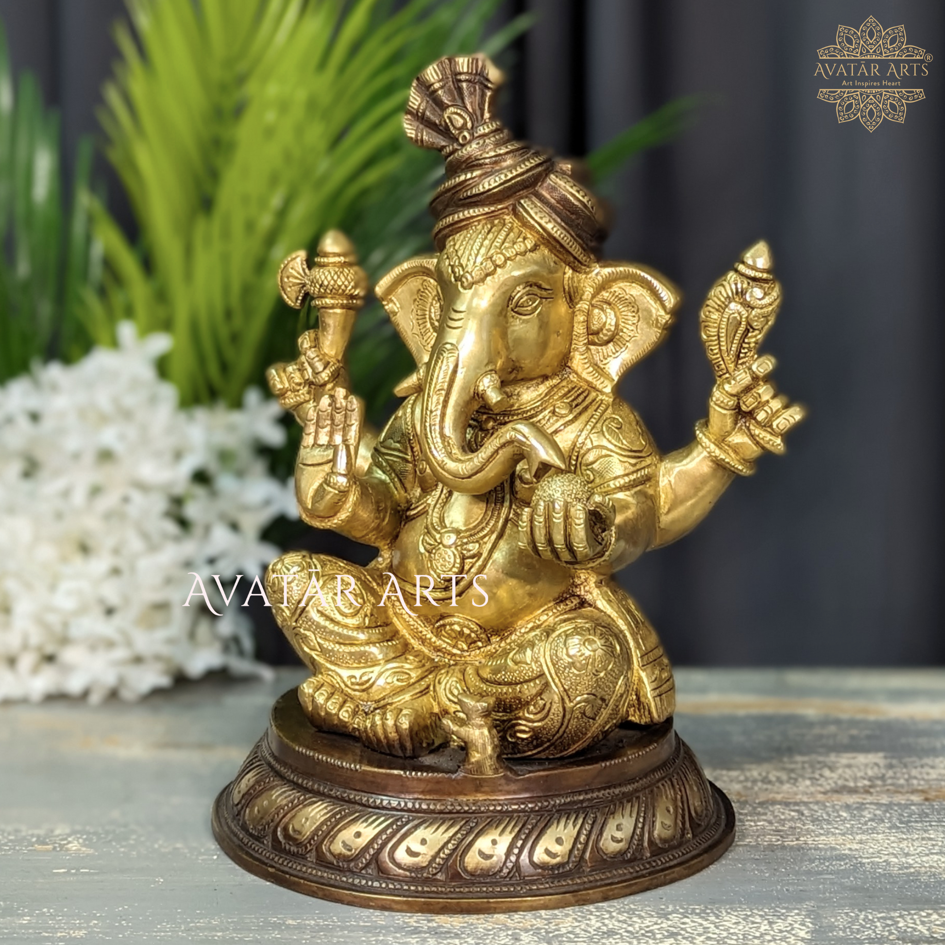 As the warm brown tones intertwine seamlessly with the radiant golden accents, the idol emanates a celestial glow, symbolising prosperity and positive energy. An embodiment of grace and wisdom, this Ganesha idol stands as a timeless piece, harmonizing tradition with contemporary aesthetics. May its presence in your space bring blessings and joy.