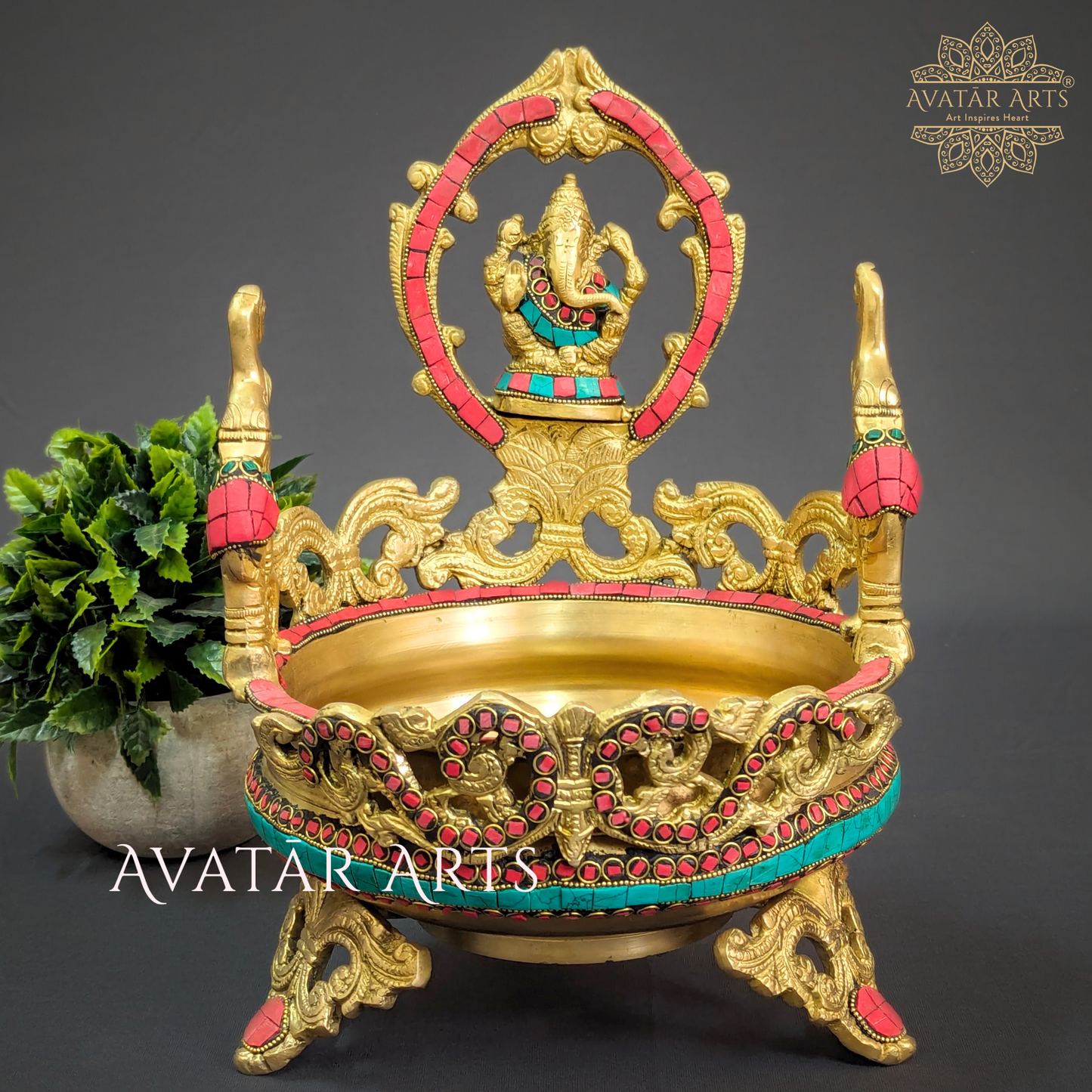 Embrace the divine aura of Lord Ganesha with our exquisite brass urli adorned with intricate carvings and vibrant colored stones. Crafted with the utmost precision and finest quality brass, this masterpiece exudes elegance and charm, perfect for enhancing your home decor.