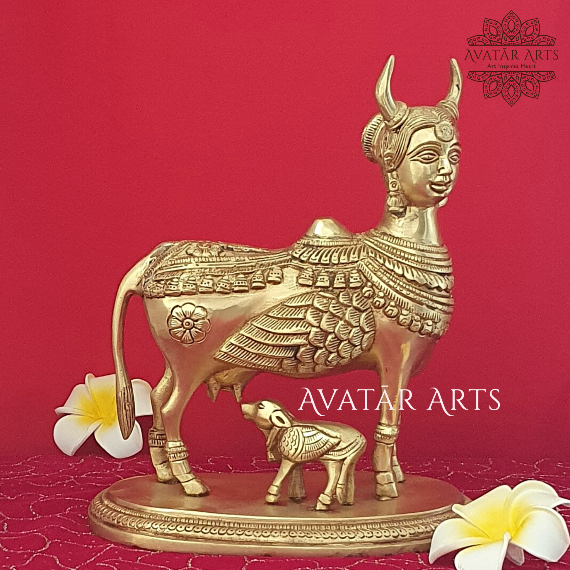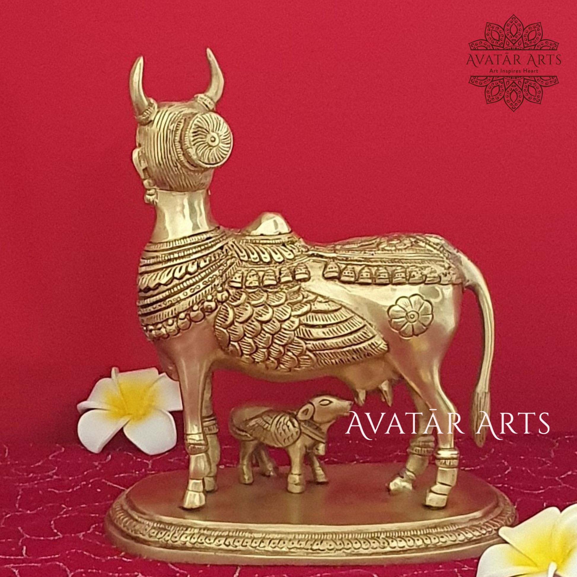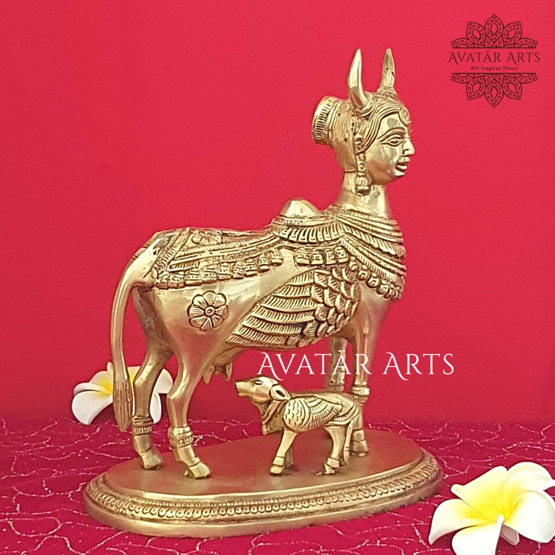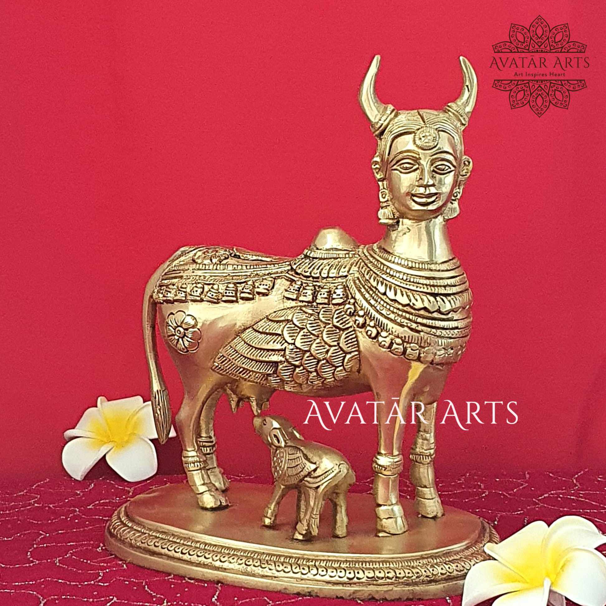 Kamadhenu cow along with her calf is a symbol of success, wealth, motherly love and prosperity. Kamadhenu is idealized for her generosity and association with motherhood.