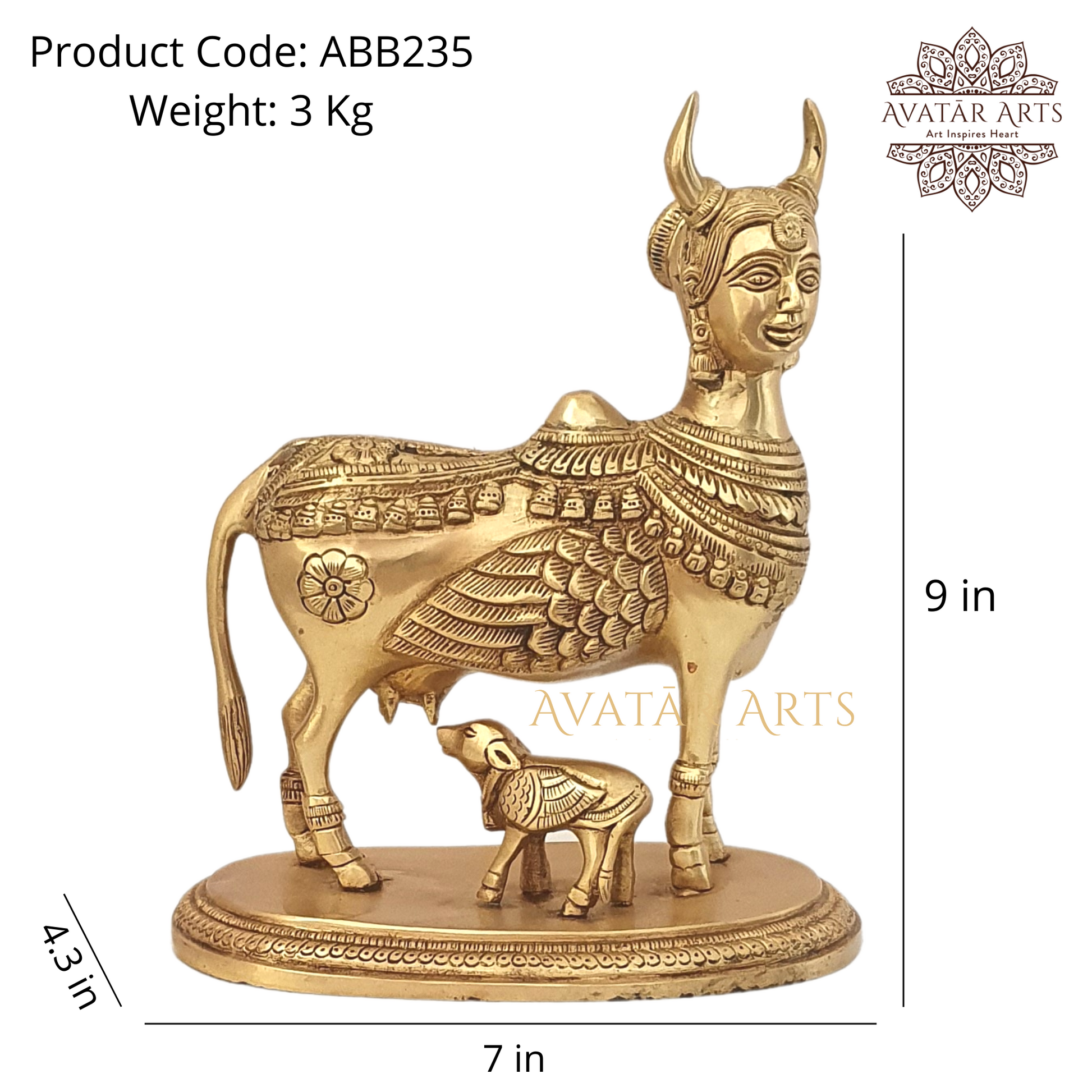 This idol of Kamadhenu and her calf is made of high quality Brass by talented artisans. The idol portrays the calf standing in the protection of Kamadhenu, who gives milk, warmth and protection to the calf without any questions because that's the way all mothers shower love on their child. The sturdy yet subtly carved platform is the perfect base for them as it highlights their intricate features. The masterpiece has a very unique and magnificent design, which enhances its beauty and magnificence.