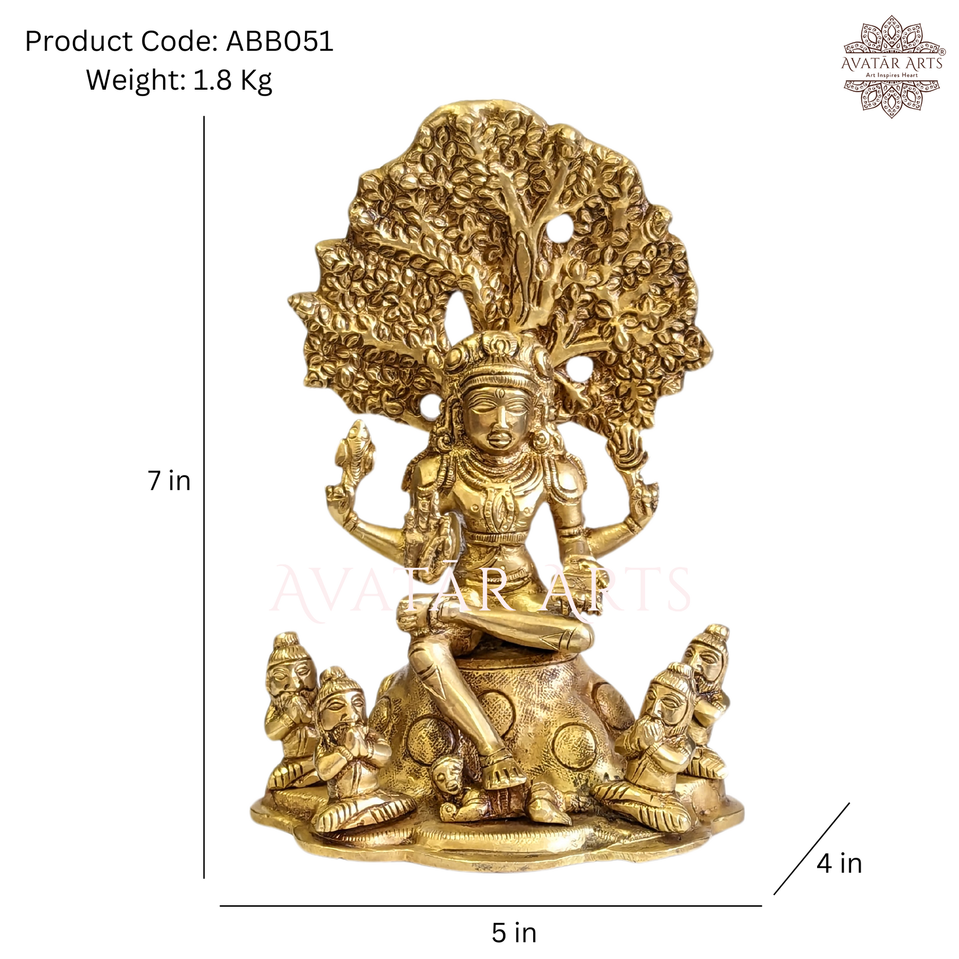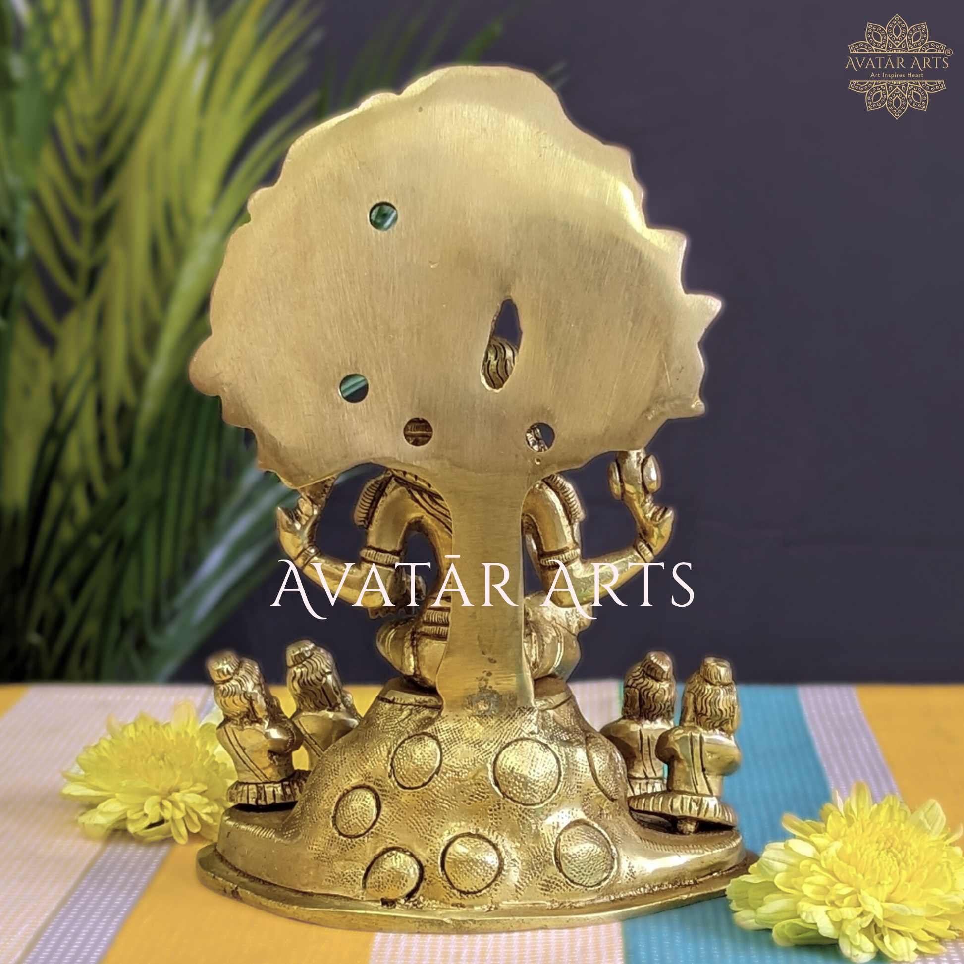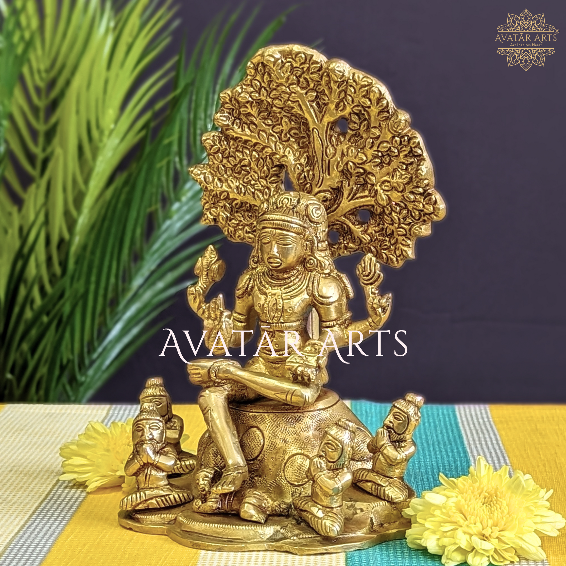 This Brass Lord Dakshinamurthy idol portrays the Lord sitting in his authentic posture, which enhances the divinity of the idol. The artisan's attention to detail is incredible as the idol not only depicts all the symbols of the Lord, but it also shows his disciples meditating and praying around him.