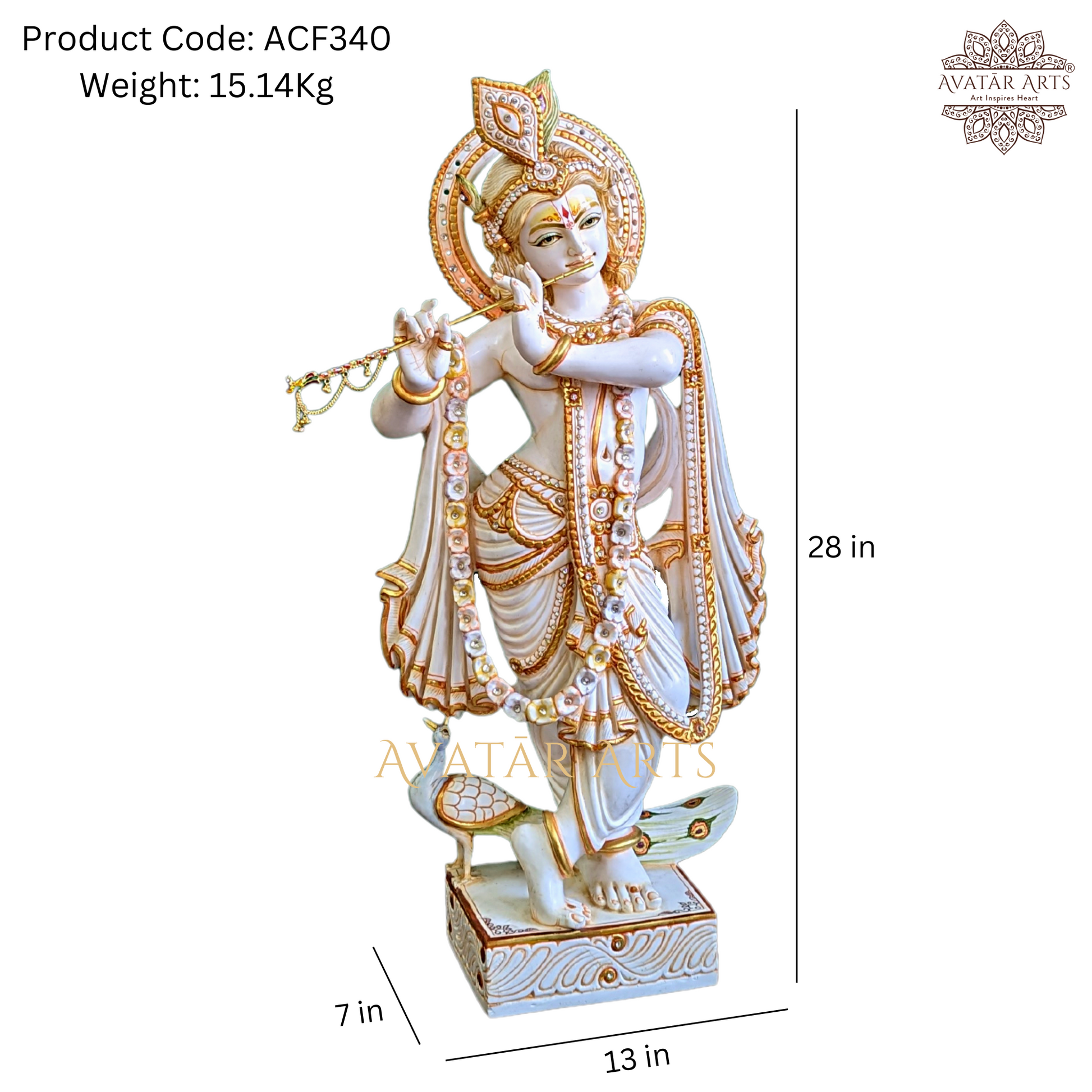 In this Lord krishna idol, Lord krishna is depicted in his signature pose, unwinding and playing the flute, while his flute signifies the divine call that attracts us to the Supreme. His peacock feather headgear symbolizes the victory of the divine over the demonic, and his lotus-like eyes represent enlightenment and knowledge.