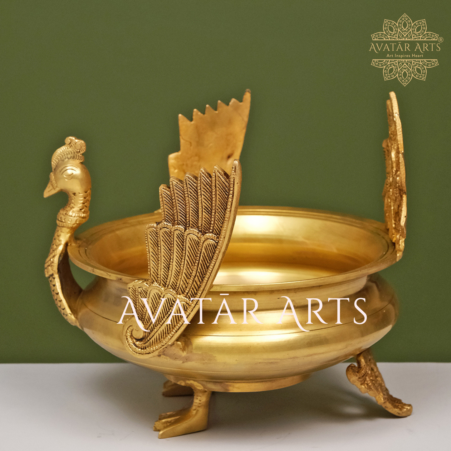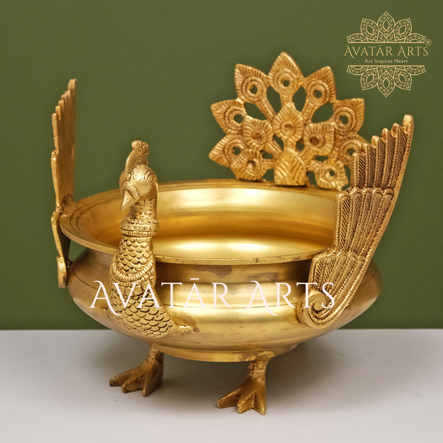 Add to your collection the lovely peacock shaped urli. Made of the finest brass with elaborate detailing, this exquisite piece adds glamour to any place. Its elegant shape as well as gleaming brass will serve as a decorative piece in any sitting area or entryway, which can be used to contain or wet-carry flowers or floating candles for special days.