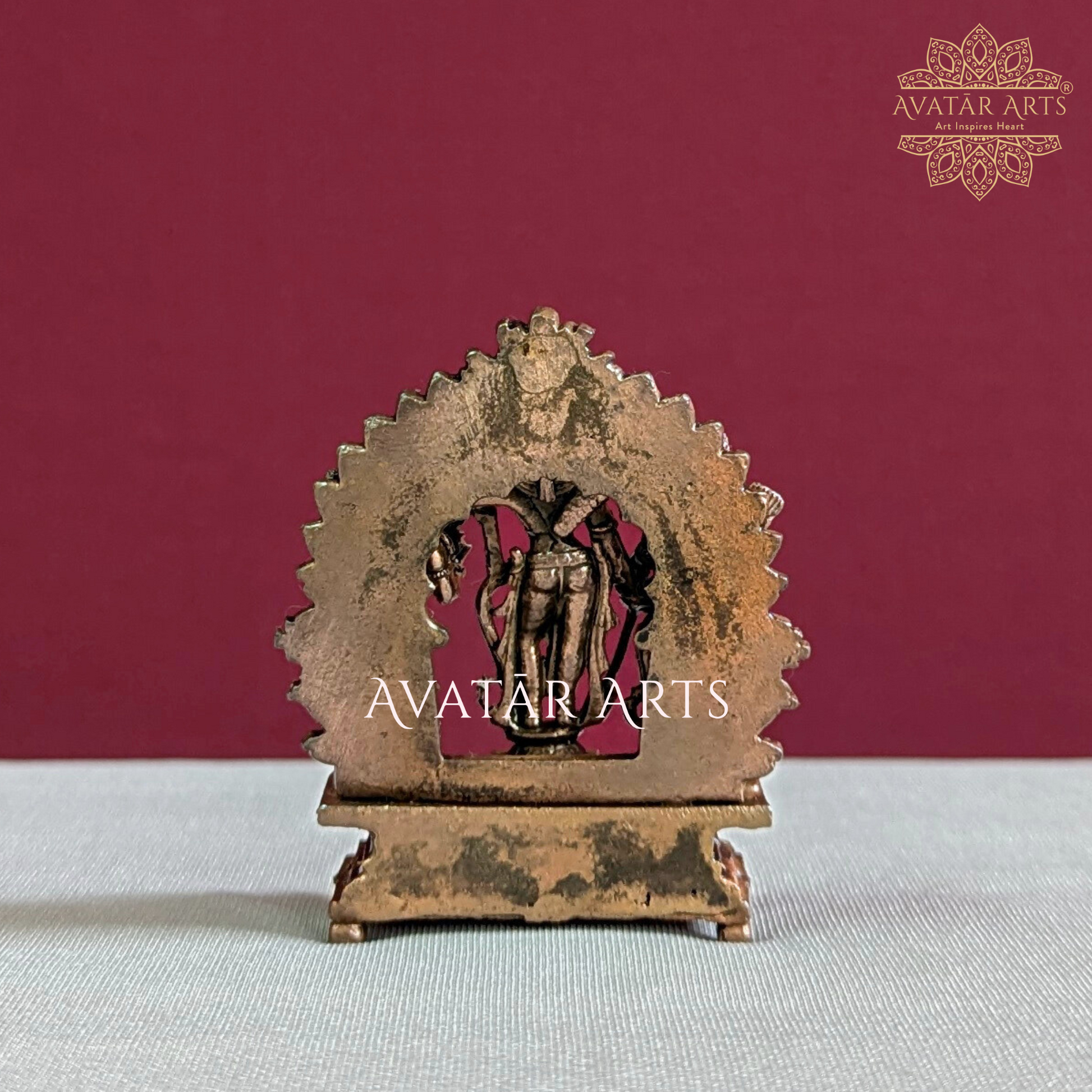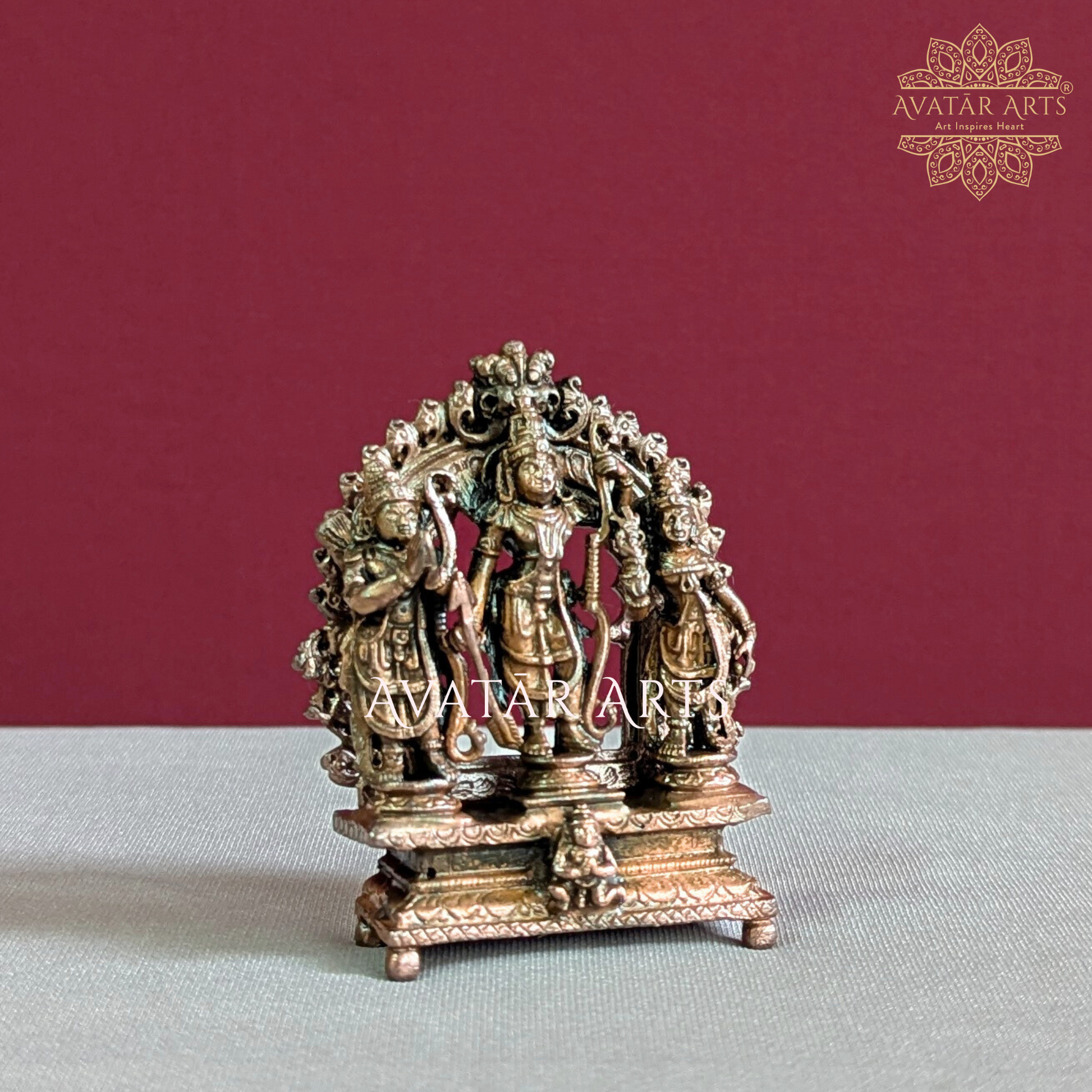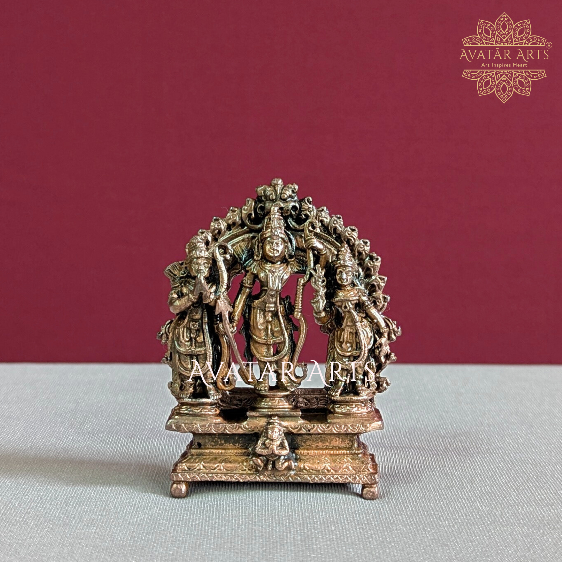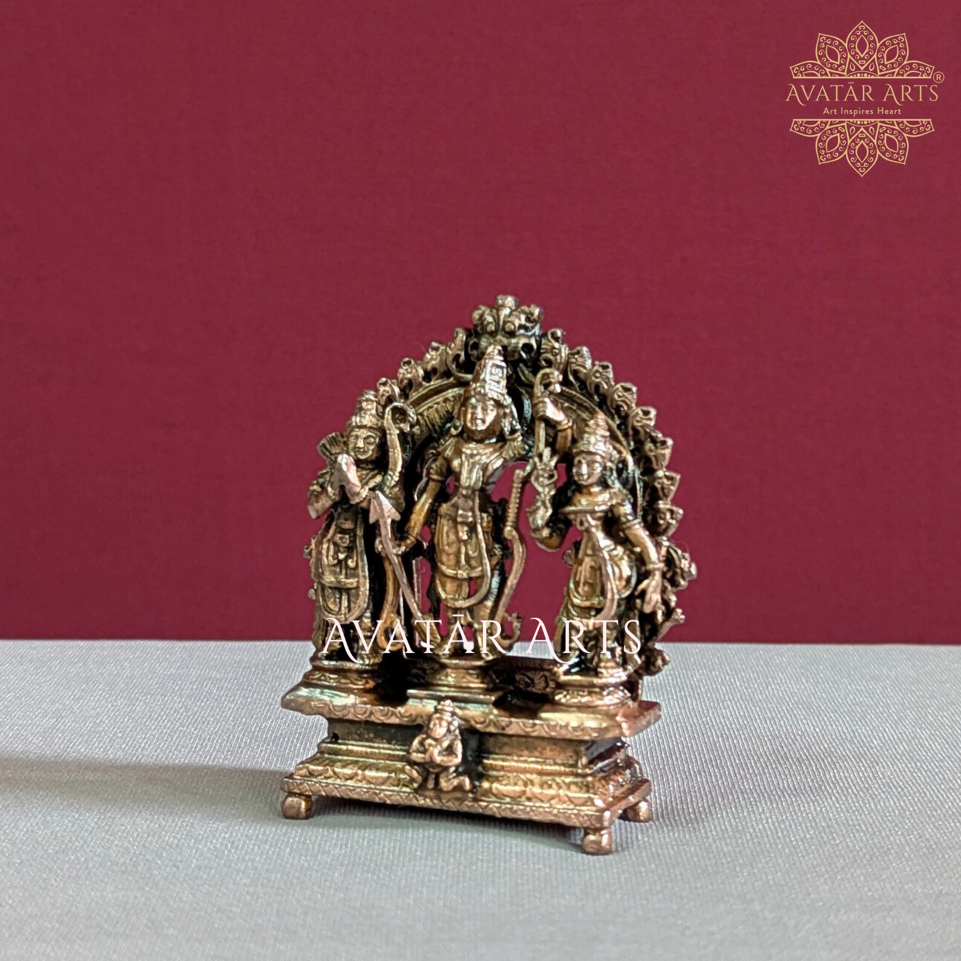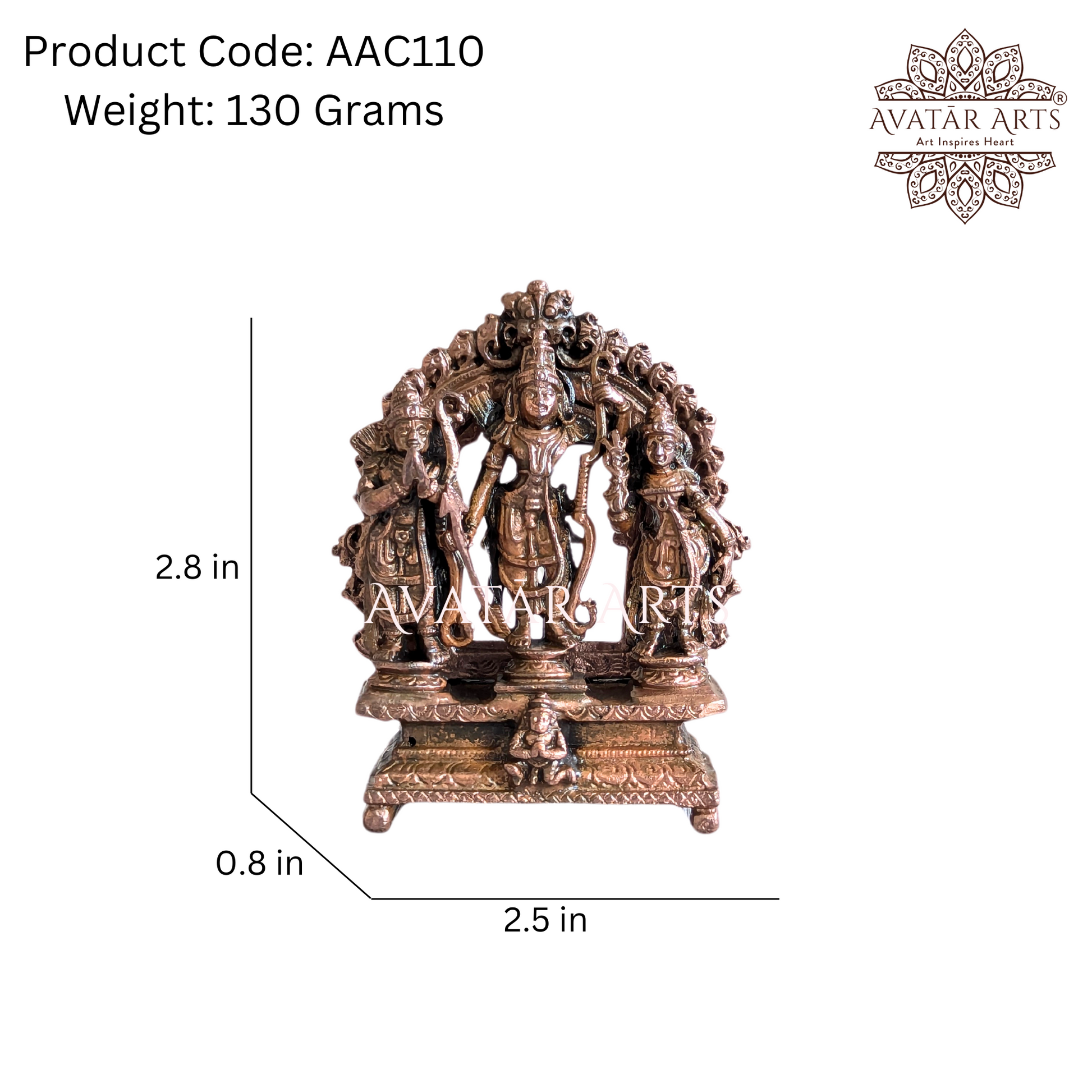 Introducing our beautifully crafted copper idol of Shree Ram Darbaar, perfect for your home altar. Though small in size, this piece stands out with its intricate carvings, capturing the grace and divinity of Lord Ram, Sita, Lakshman, and Hanuman. The idol also features a detachable Yalli arch at the back, adding a traditional touch to its design.