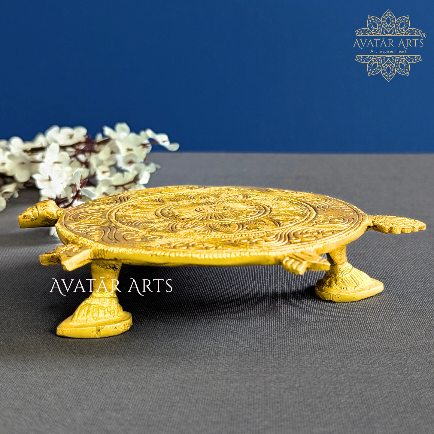 The Brass Tortoise Chowki is a beautifully crafted piece that serves multiple purposes in your home or temple. It can be used to place idols, or a Mangal Kalasha, adding a spiritual touch to your space. Its elegant design also makes it a perfect showcase for your favorite showpieces, infusing your surroundings with a sense of peace and positive energy. This devotional and decorative item not only enhances the aesthetic appeal of any room but also promotes a serene atmosphere, bringing in divine blessings and good fortune. A perfect blend of functionality and beauty for any home or temple.