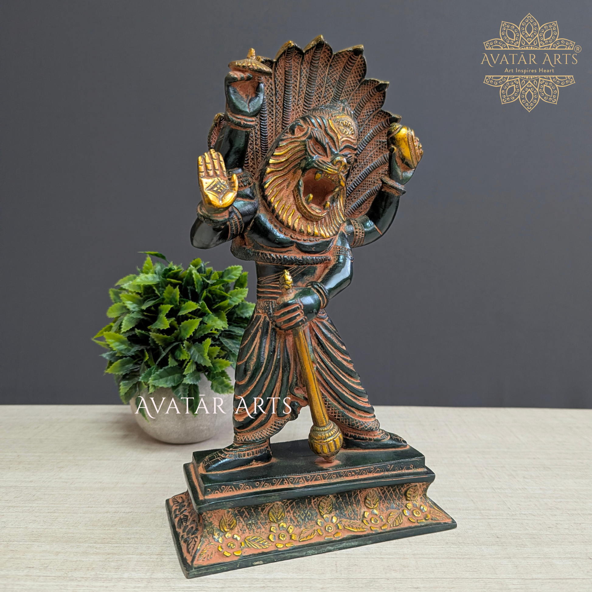 Bring home the divine strength of Lord Narasimha with our exquisitely handcrafted brass statue. Made from the best quality brass and finished in a graceful antique patina, this idol showcases beautiful hand-carved detailing that highlights the fierce yet protective form of Narasimha. A perfect addition to your home decor, this powerful deity is believed to bring protection, courage, and positive energy into your space. Ideal for pooja rooms, living room decor, or as a thoughtful Handmade Gift for loved ones, this masterpiece enhances any setting with its traditional Indian artistry and premium workmanship.
