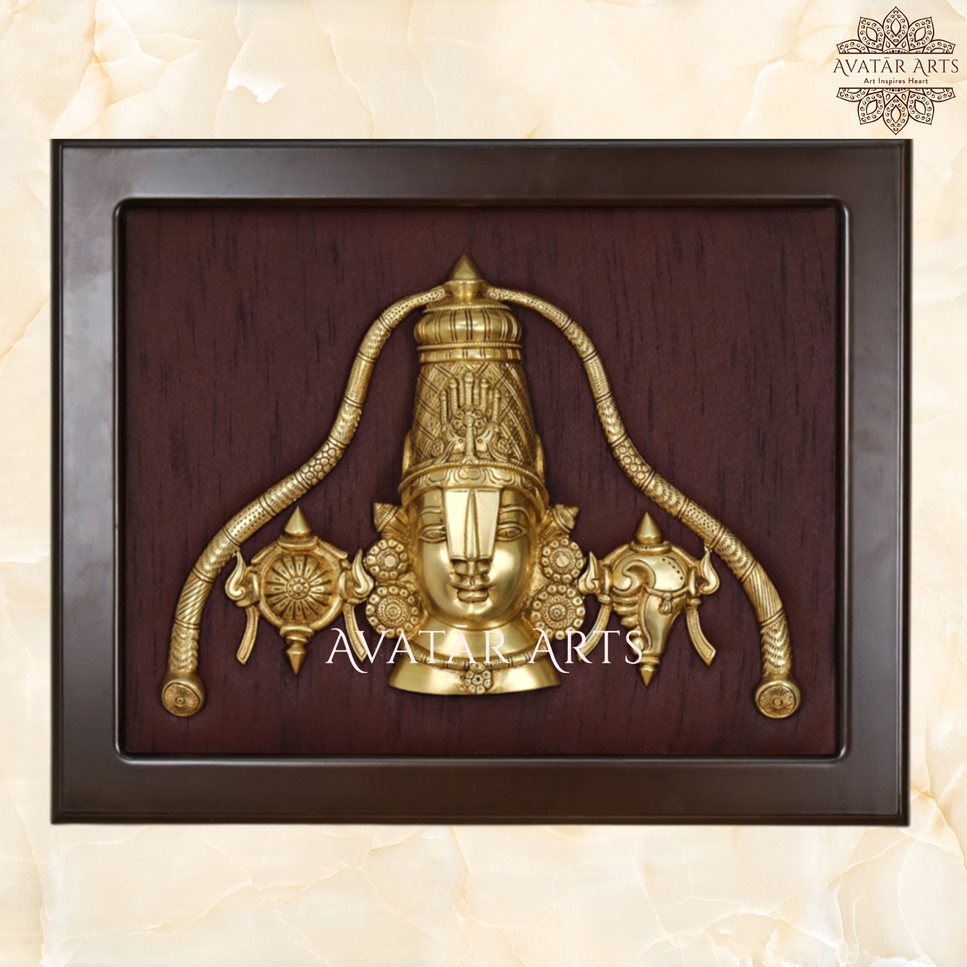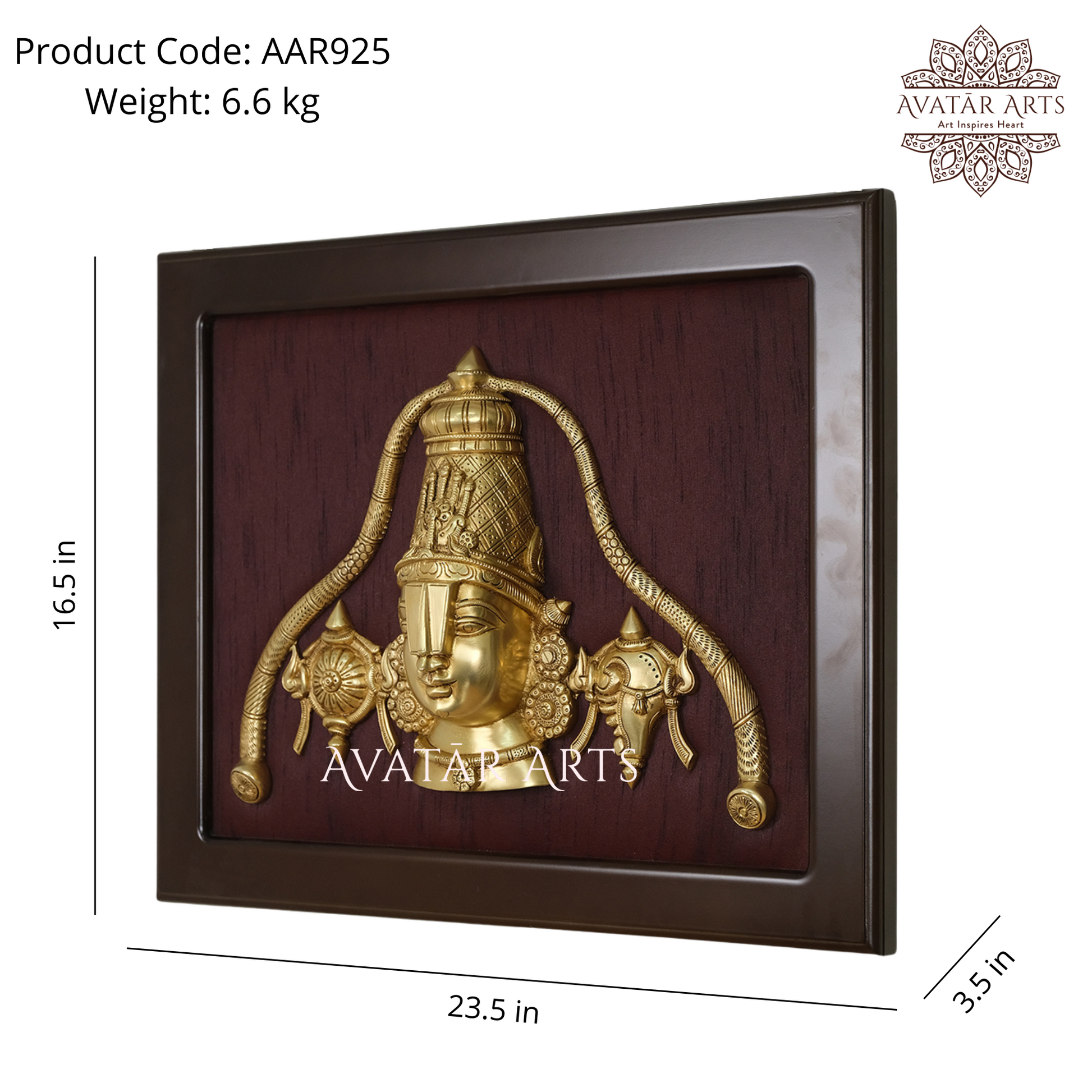 | Lord Venkateshwara, who is also lovingly called by his devotees as Balaji or Govinda, is an avatar of the great Lord Vishnu, is the God who is known to destroy the sins of the people. This Brass Lord Balaji figurine is enclosed inside a lovely frame that perfectly complements the aura of the deity. The high quality Brass and the silk fabric background enhances the majesticity associated with it. The artisans have left no aspect overlooked and have added a Shankh and Chakra on either side of Lord Balaji, which further enhances its authenticity. The simple yet brilliant design makes it stand out in any environment! Let's bow down and seek blessings from Lord Venkateshwara by bringing home this Brass Balaji frame! The Frame is made from wood and Lord Balaji is made from high quality Brass. The astounding workmanship of the frame ensures that there's an essence of the frame itself along with the magical and divine essence of Lord Balaji, and one look at the idol will make you feel as if you're stepping foot into the famous Tirupati Balaji temple itself! |